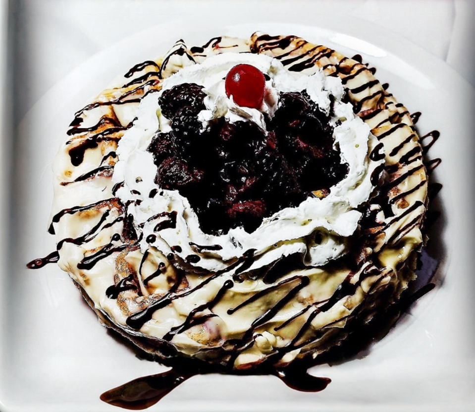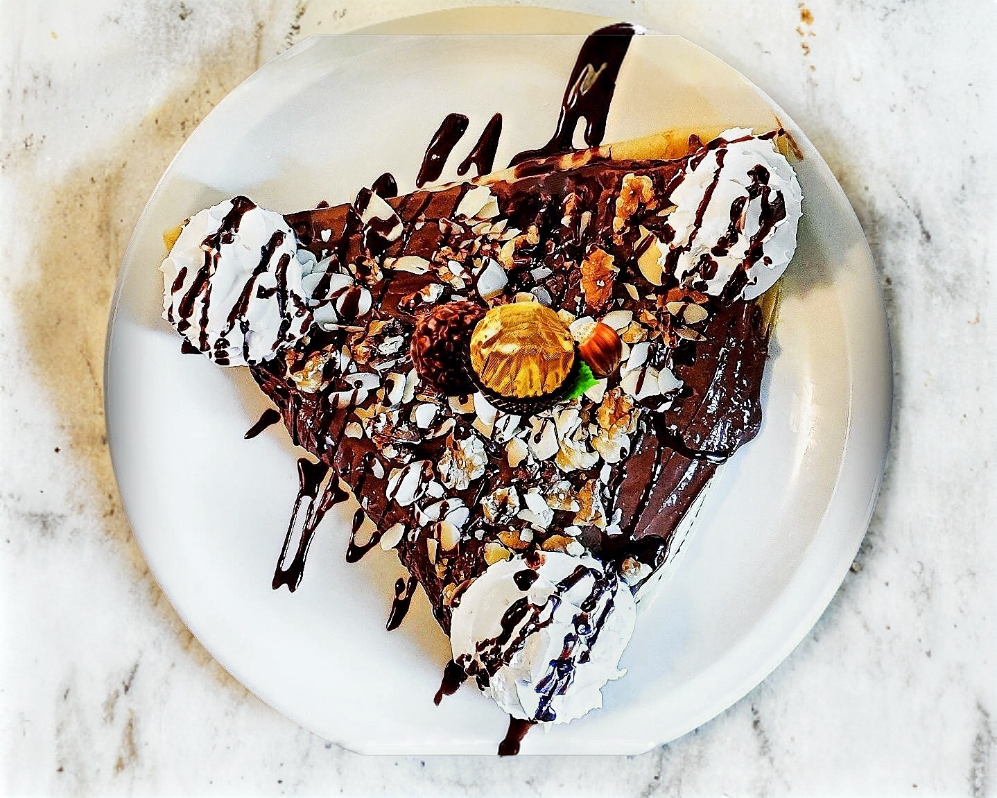 Receta francesa. Crepa rellena y cubierta de chocolate fondue, almendras, nuez, crema batida, chocolate líquido, un preparado a base de queso philadelphia y una o varias frutas a escoger: Fresa, frutos rojos del bosque, plátano, plátano macho o manzana verde.