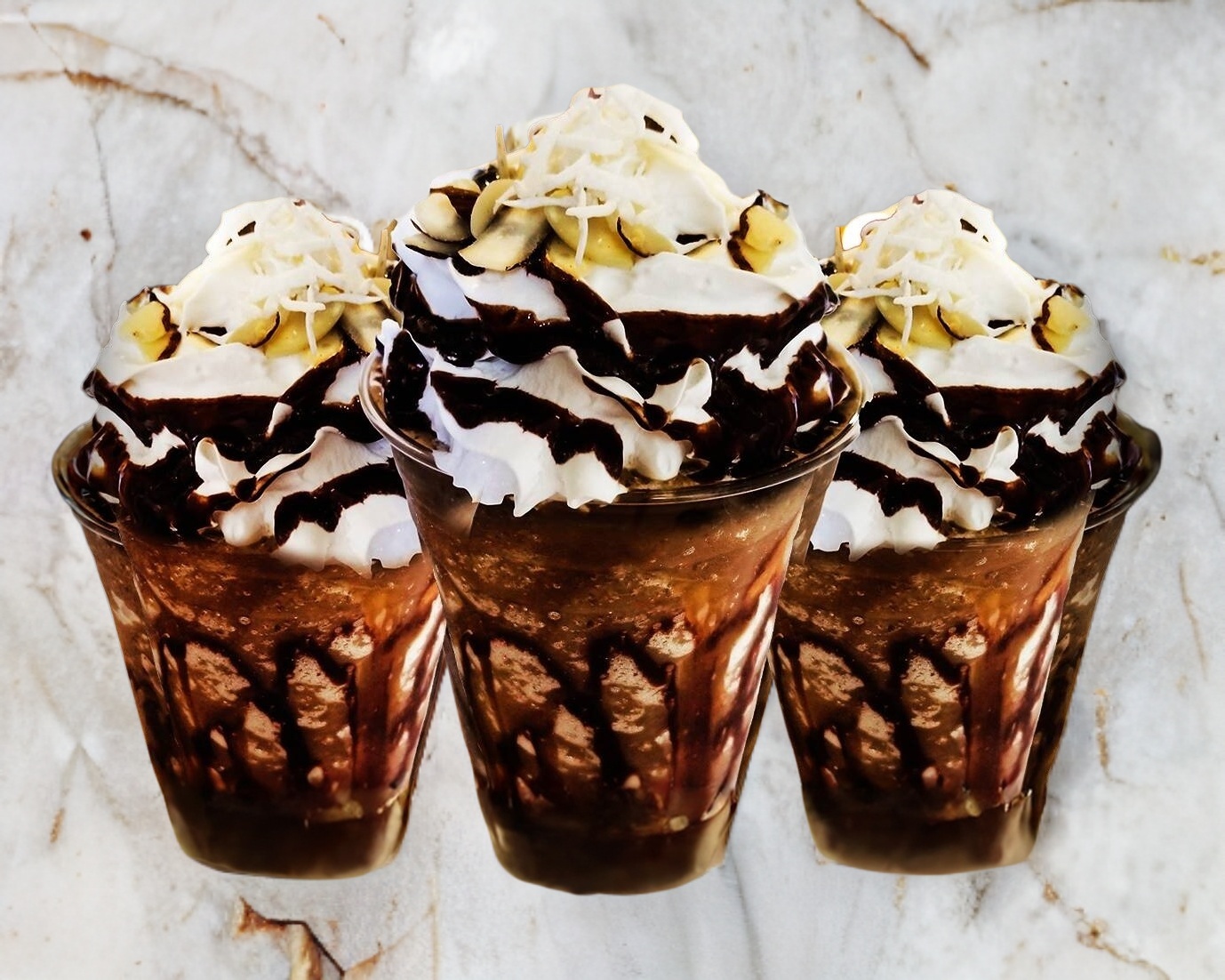 Café Espresso frappeado con leche, chocolate Almond Joy, crema batida, almendra y coco natural.