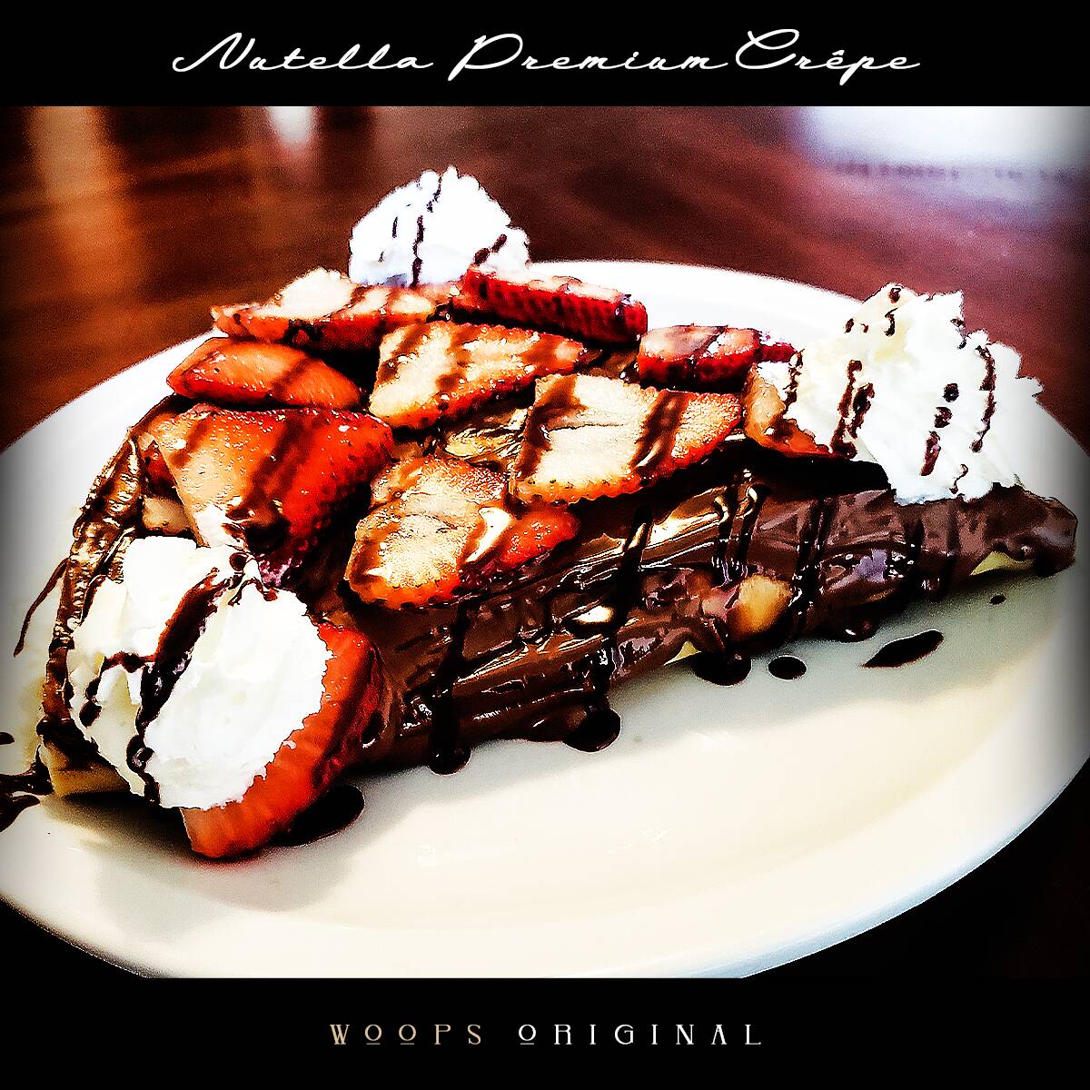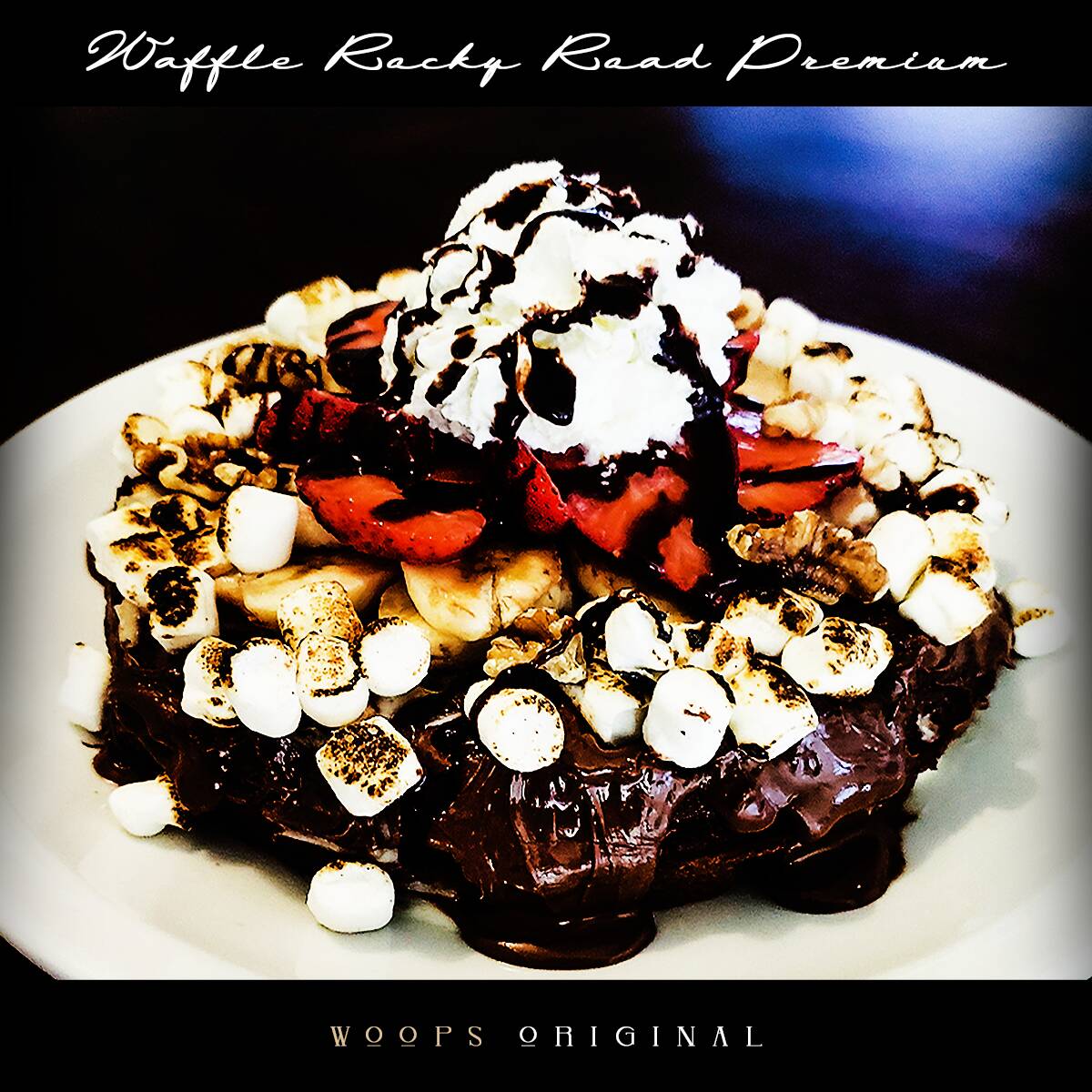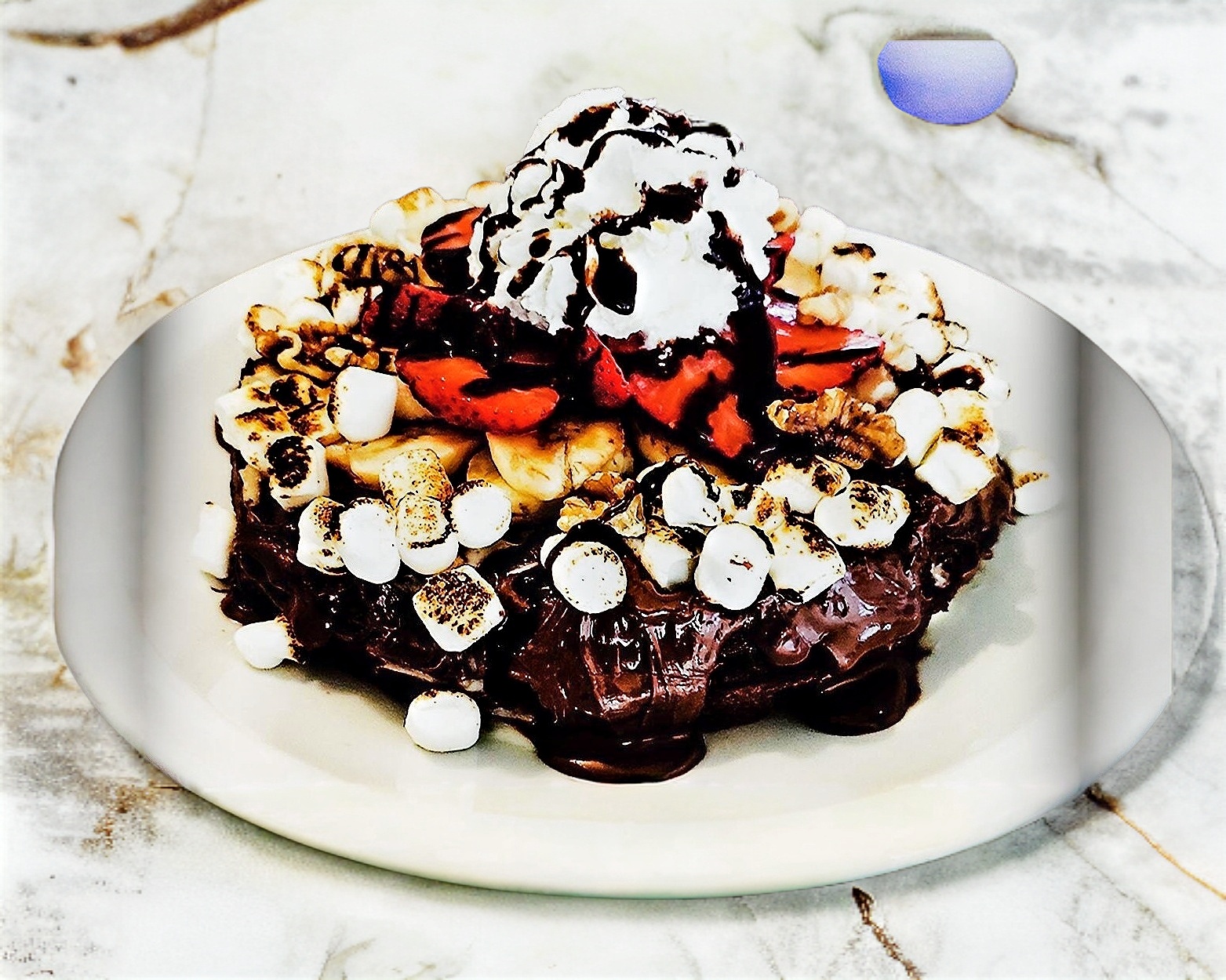 Waffle Belga Premium con una mezcla original de nutella, nuez, fruta a escoger, crema batida y malvaviscos flameados.