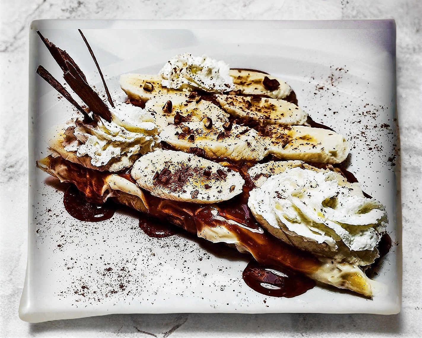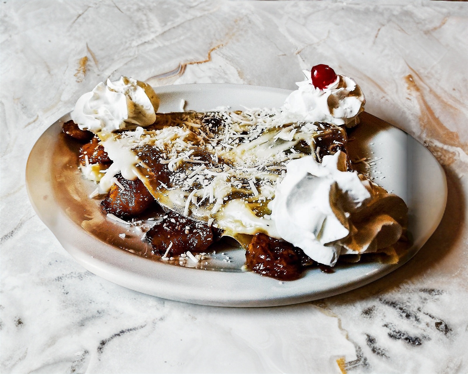 Receta francesa. Crepa con plátano, cajeta, nuez, crema batida y nuestro preparado "Woops" a base de queso Philadelphia.