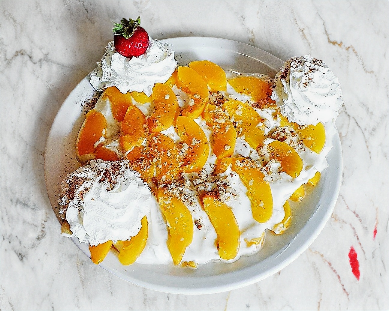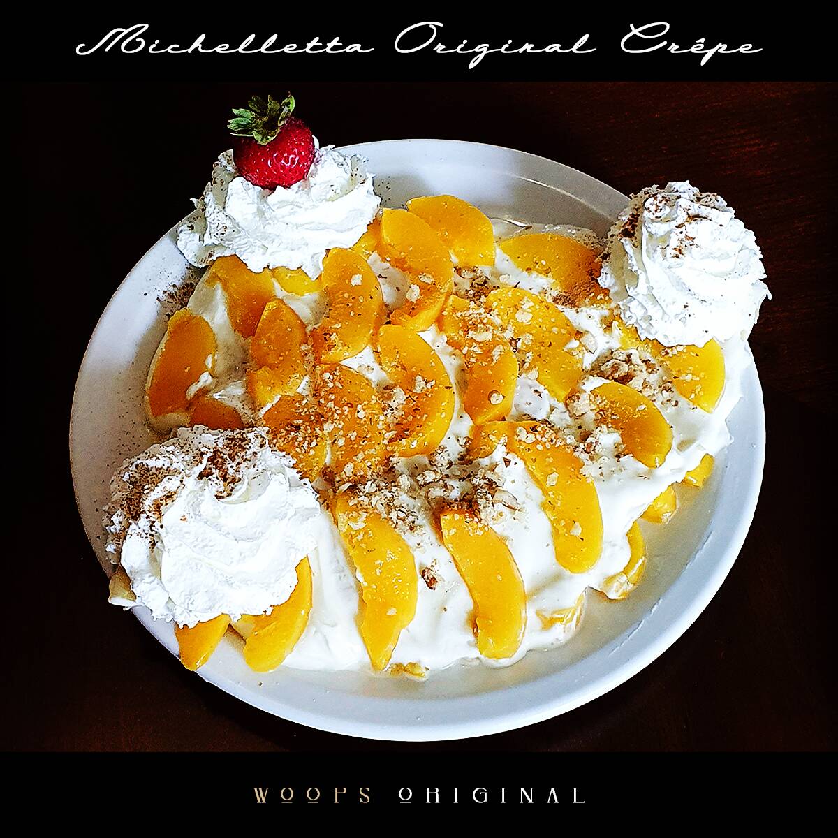 Crepa francesa con durazno en almíbar, nuez, canela, crema batida y un preparado especial a base de queso Philadelphia.