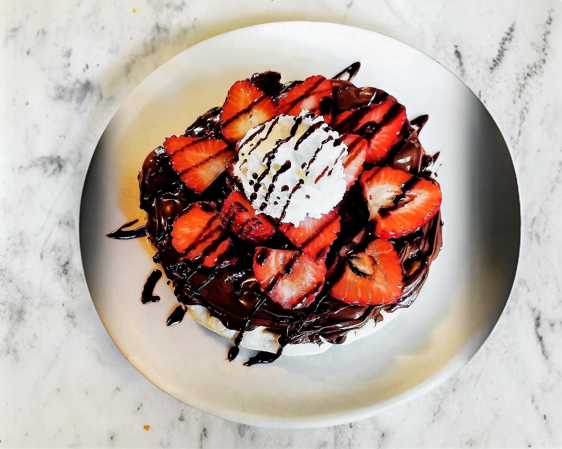 Waffle belga cubierto de Nutella, fruta a escoger, crema batida y nuez.