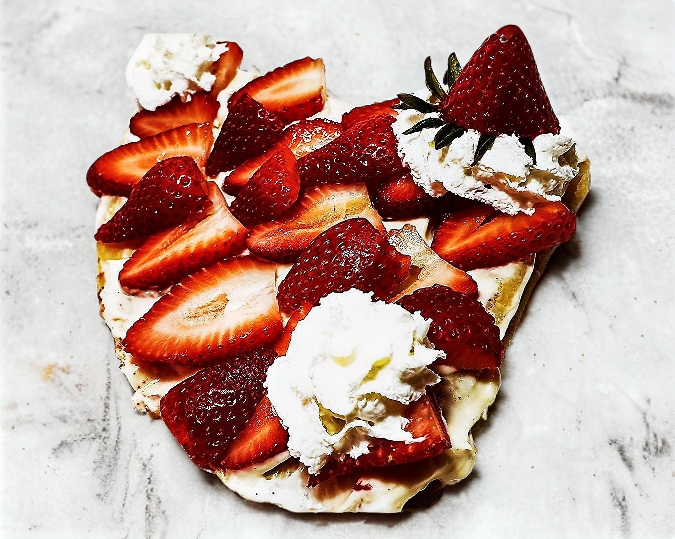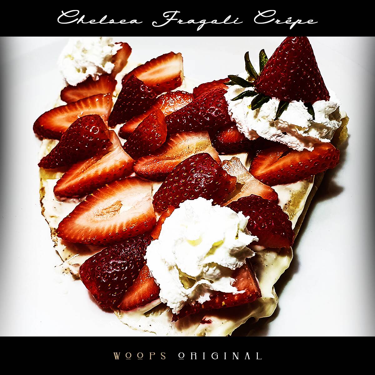 Receta francesa. Crepa en cama de fresas, balanceada con nuestro preparado a base de queso Philadelphia; crema batida y nuez.