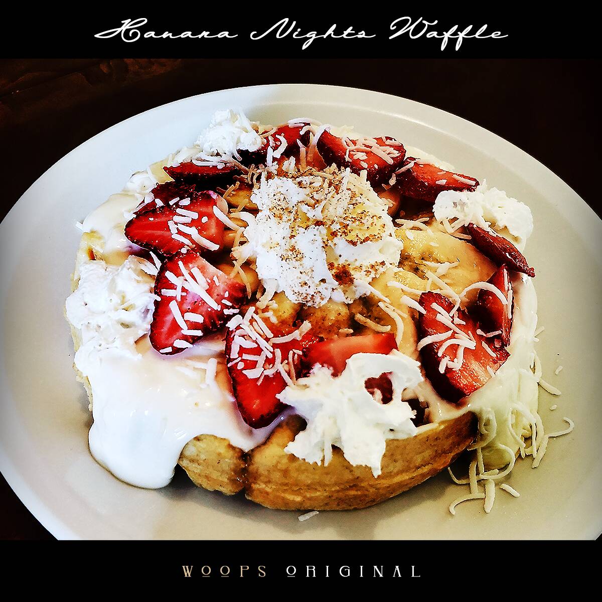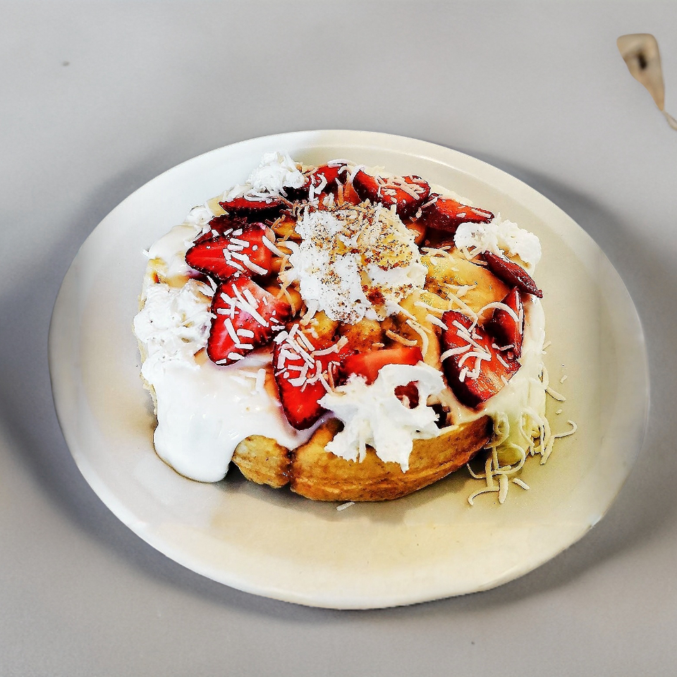 Waffle belga envinado con un dulce original de coco natural, almendra y fruta a escoger.