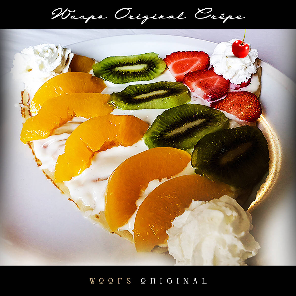 Receta francesa. Crepa con kiwi, fresa, durazno en almíbar, crema batida y el preparado "Woops!" a base de queso Philadelphia.