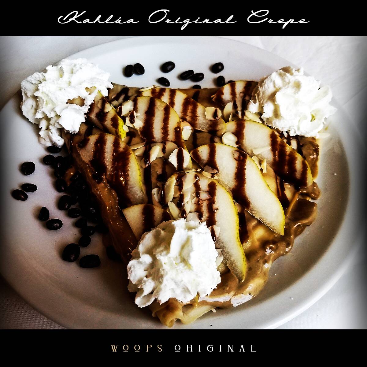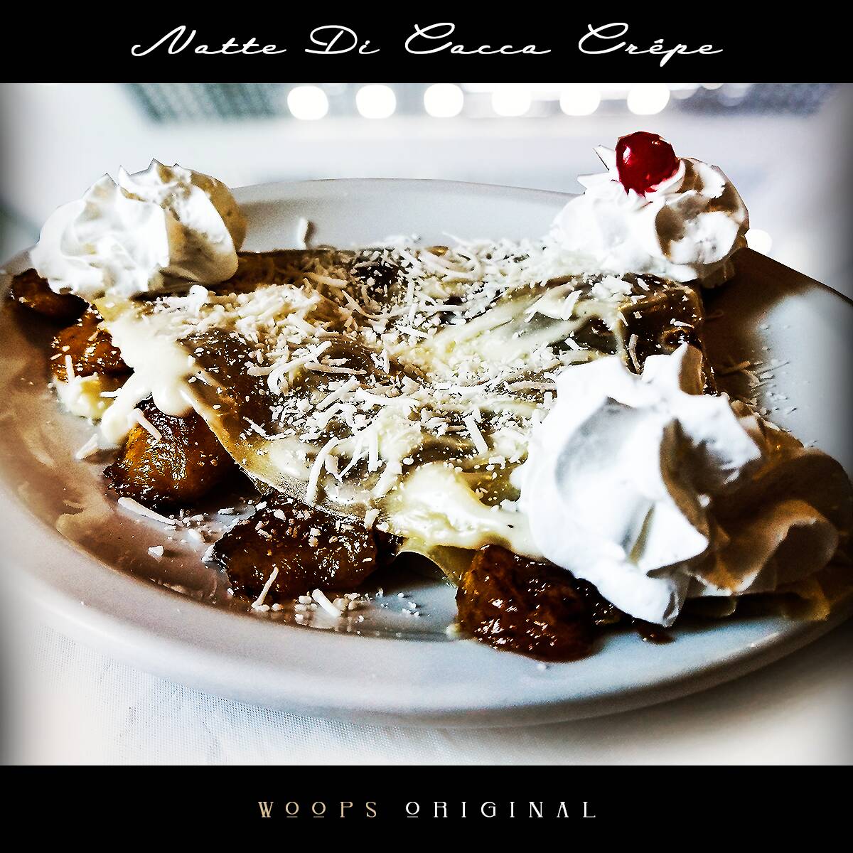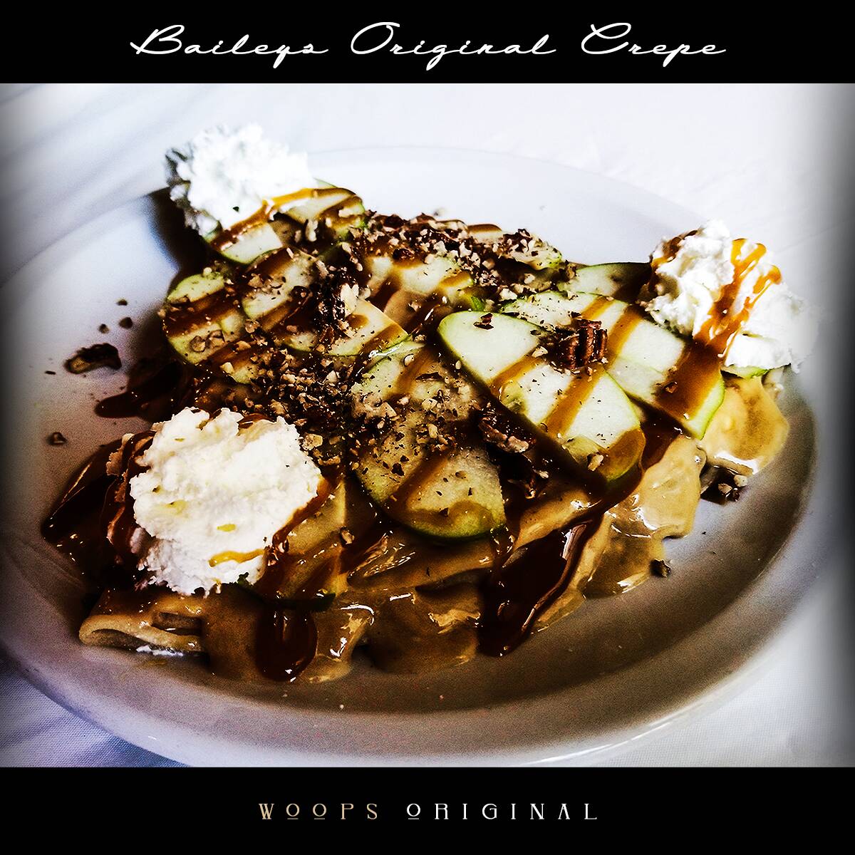 Crepa francesa envinada con licor de Crema Irlandesa Baileys y preparada a base de queso Philadelphia, nuez, almendras y una fruta a escoger: manzana verde, plátano o plátano macho. Una receta exclusiva Woops; fusionando 2 países celtas... Francia e Irlanda.
