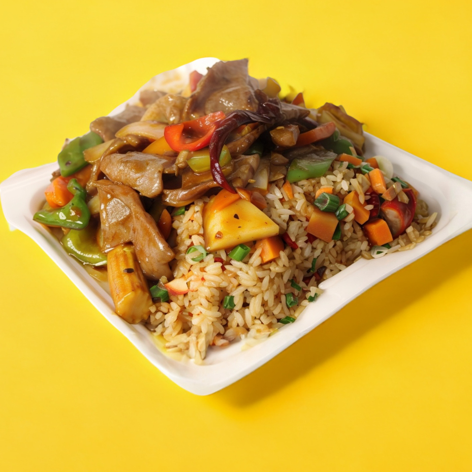 Pollo sin hueso al vapor, chile morrón,zanahoria,cebolla, chile de árbol. Incluye 1 chun Kun. Arroz frito