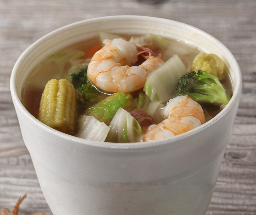 Consomé de pollo, camarón sin piel, zanahoria, brócoli, elotito.