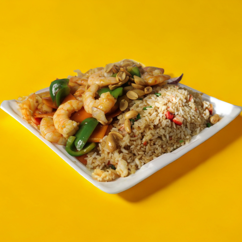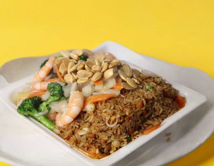 Camarón, cebolla, brocoli, zanahoria, jícama, almendras. Incluye 1 chun Kun. Arroz frito