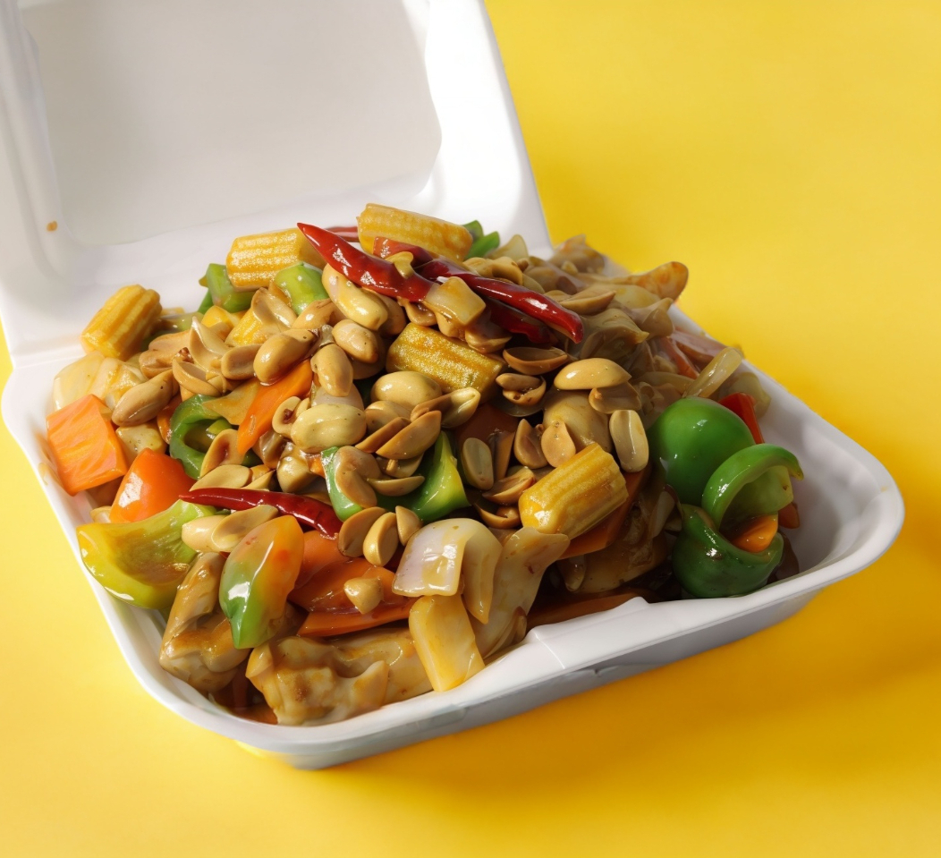 Pollo sin hueso al vapor, zanahoria, chile morrón, cebolla, elotito, chile de árbol, cacahuate, incluye 1 chun Kun. Arroz frito