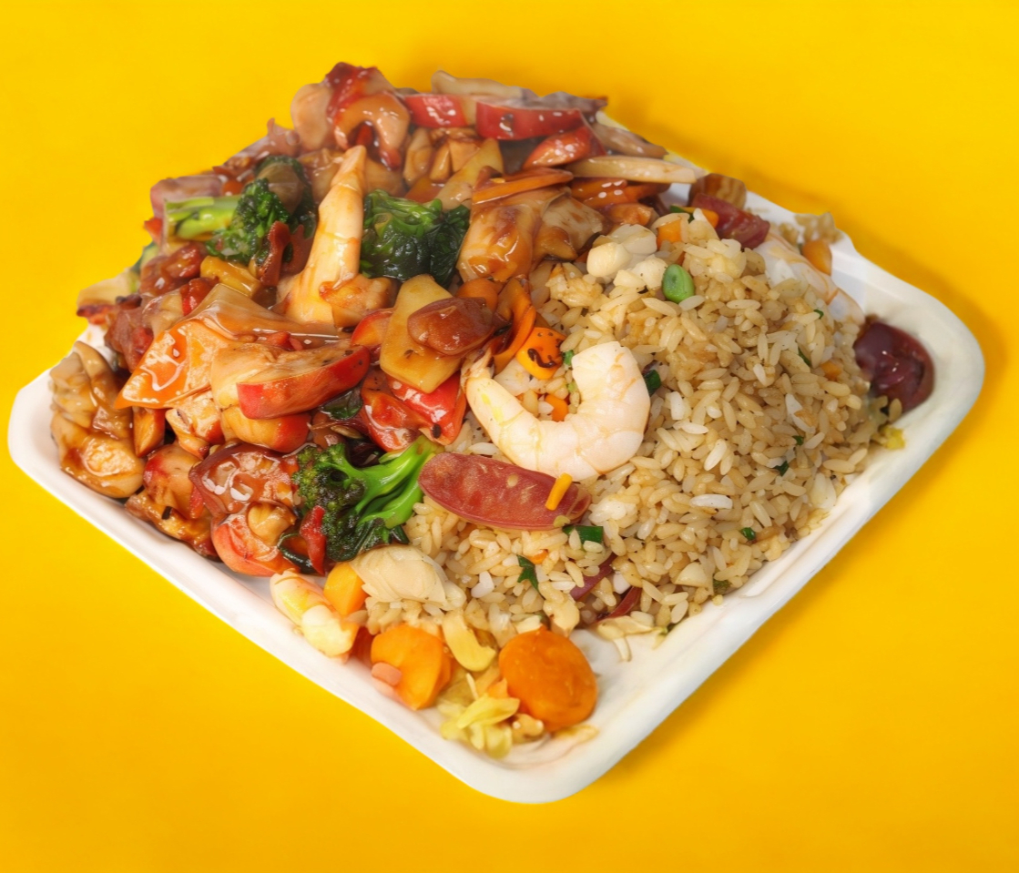 Camaró, pollo sin hueso al vapor, carnitas rojas, chorizo chino, brócoli, zanahoria, cebolla, elotito. Incluye 1 chun Kun. arroz frito