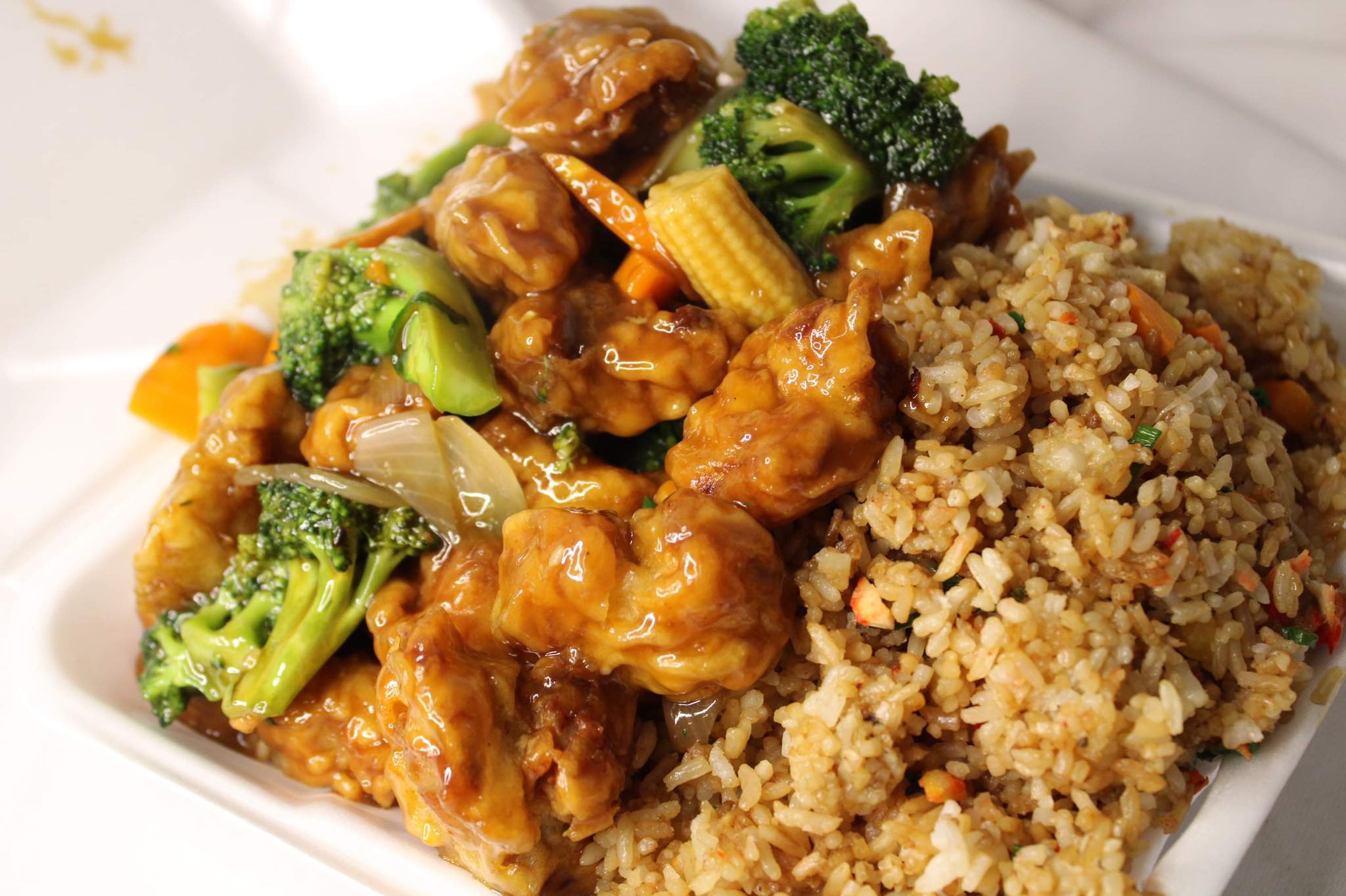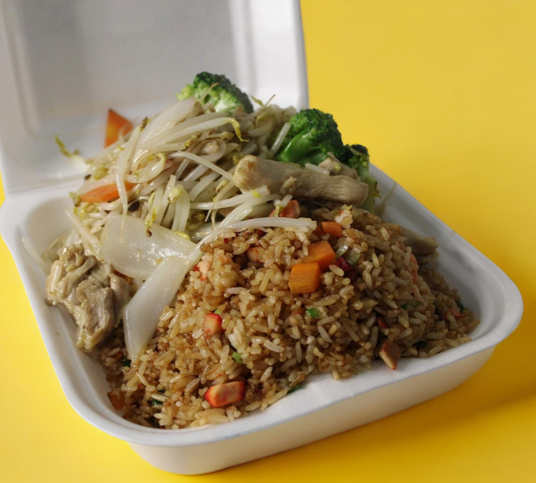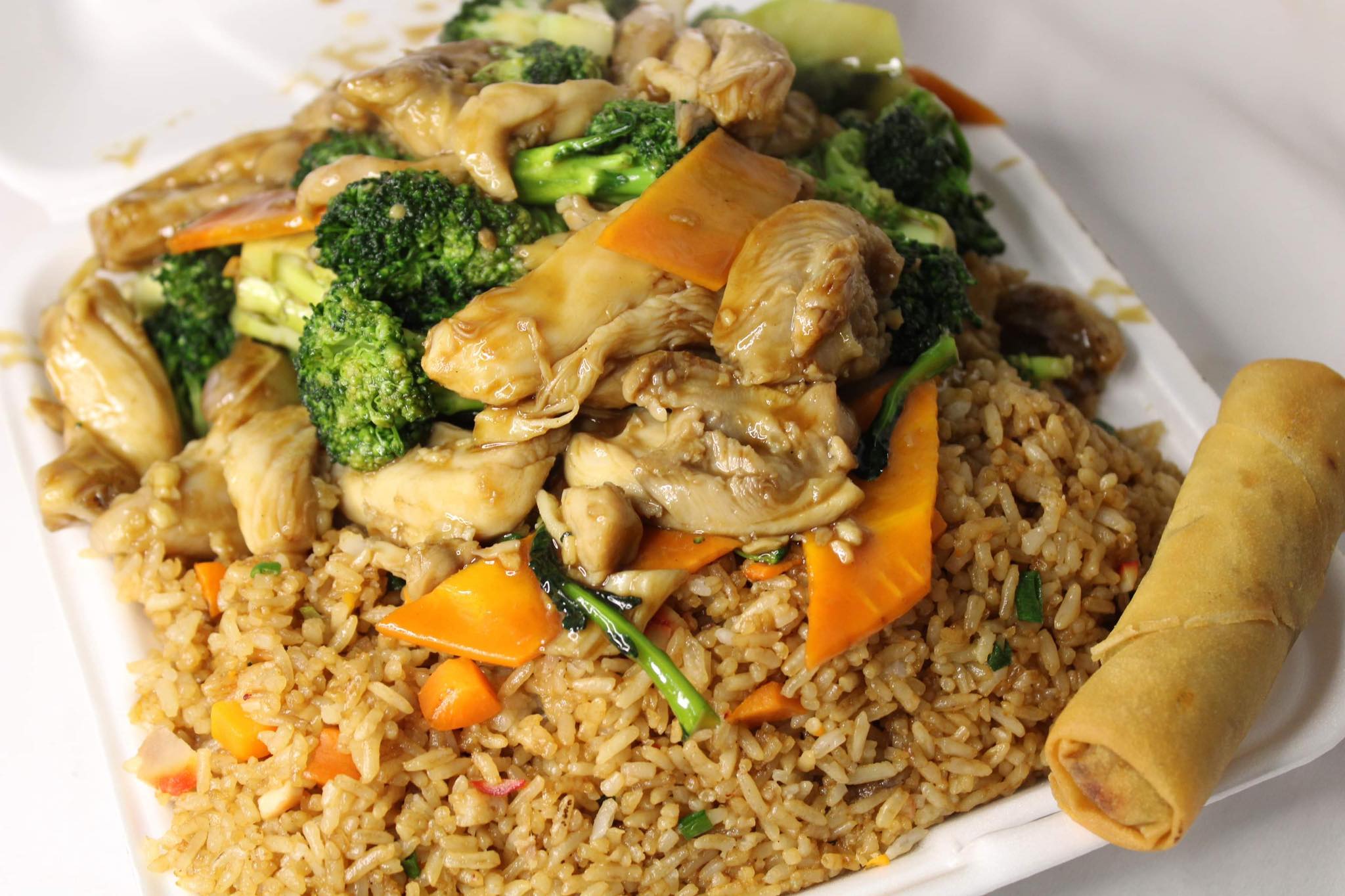 Pollo sin hueso al vapor, brocoli, zanahoria, cebolla, incluye 1 chun Kun, arroz frito.