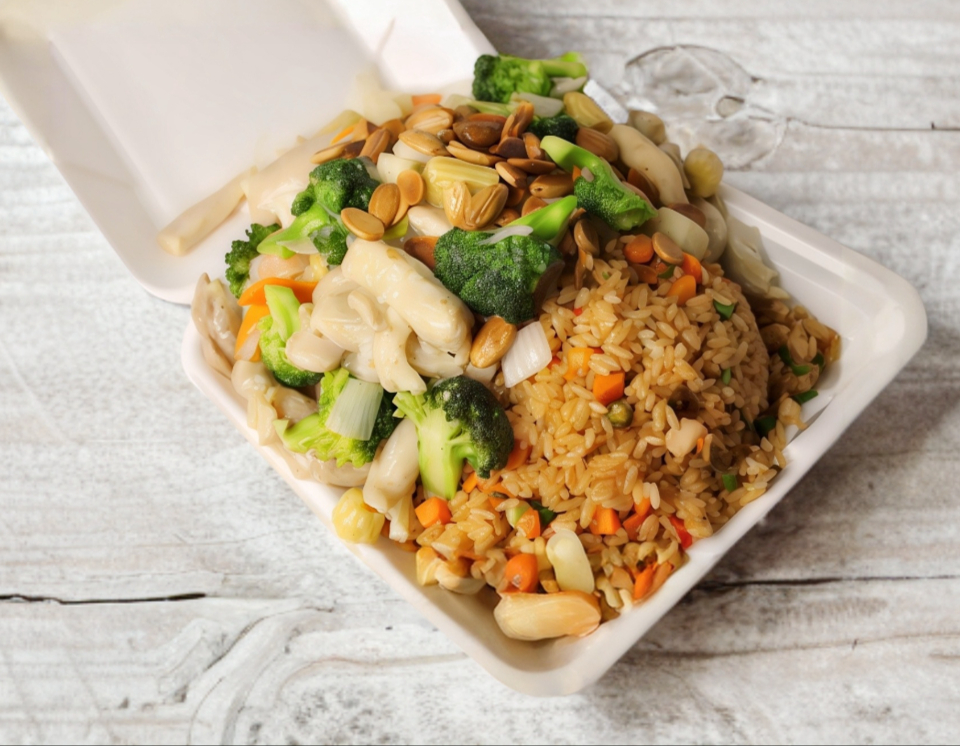 Pollo sin hueso al vapor, zanahoria, brócoli, cebolla, elotito y almendra. Incluye 1chun kun. Arroz frito