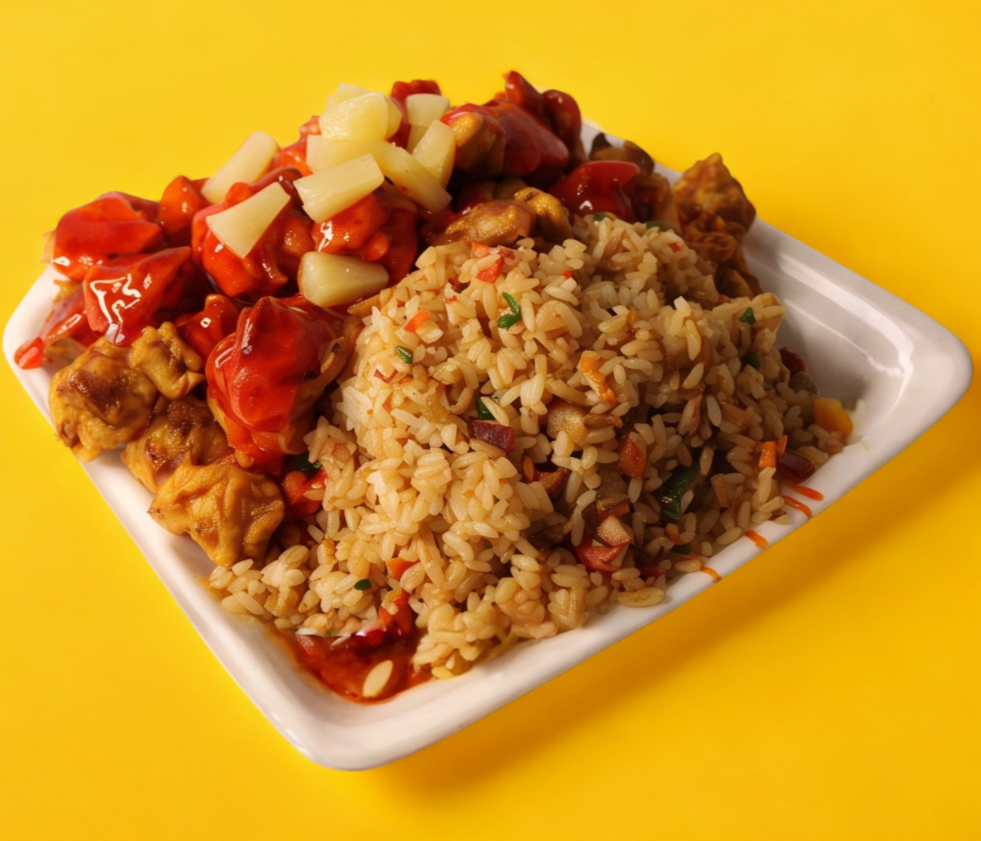 Pollo empanizado 500 gr, con jugo endulzado con piña con trozos de piña. Incluye 1 chunkun. Arroz frito y salsa agridulce