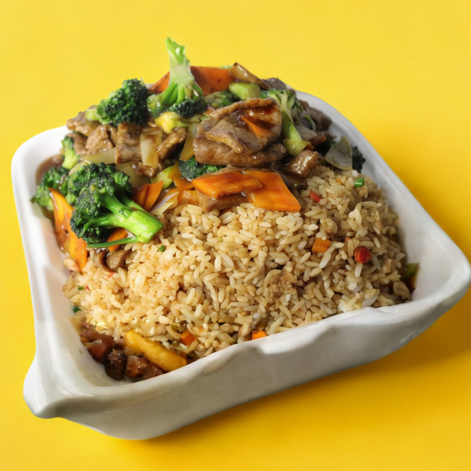 Res, brócoli, cebolla, zanahoria. Incluye 1 chun Kun. Arroz frito