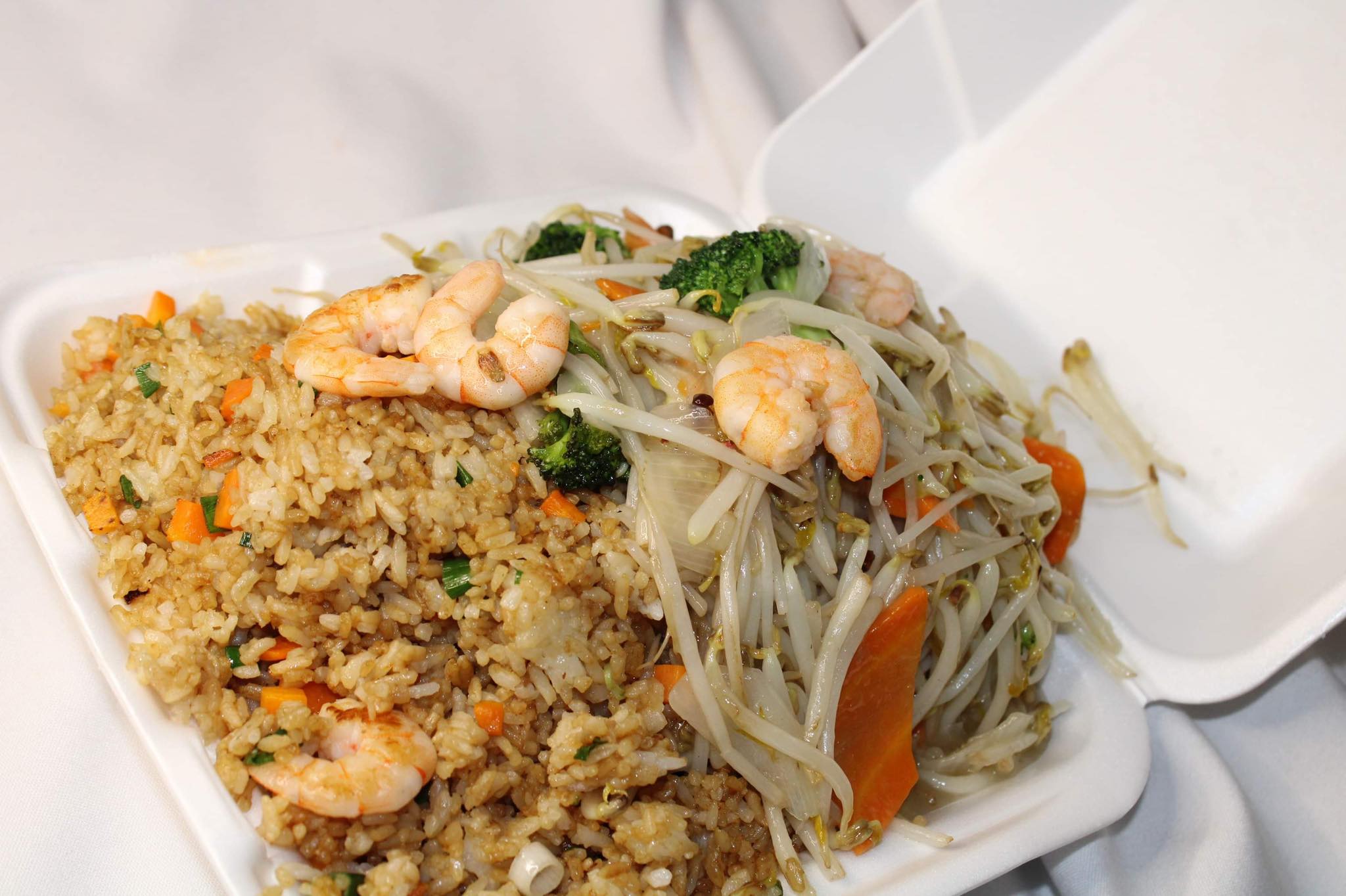 Chop Suey, camarón sin piel, zanahoria, cebolla, elotito, brocoli. Incluye 1 chun Kun. Arroz frito