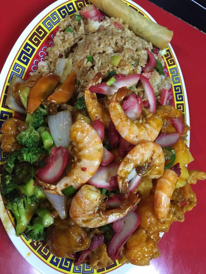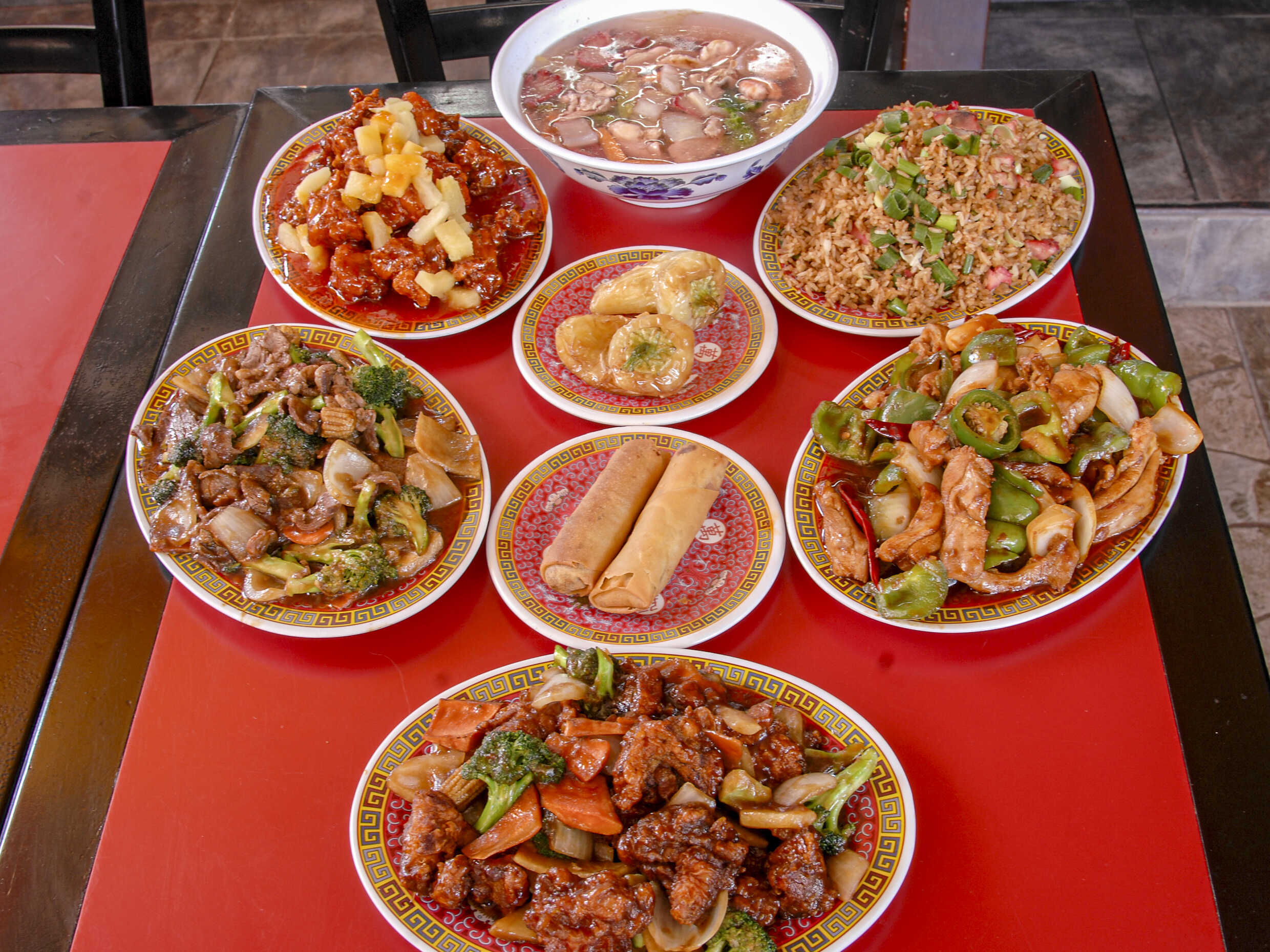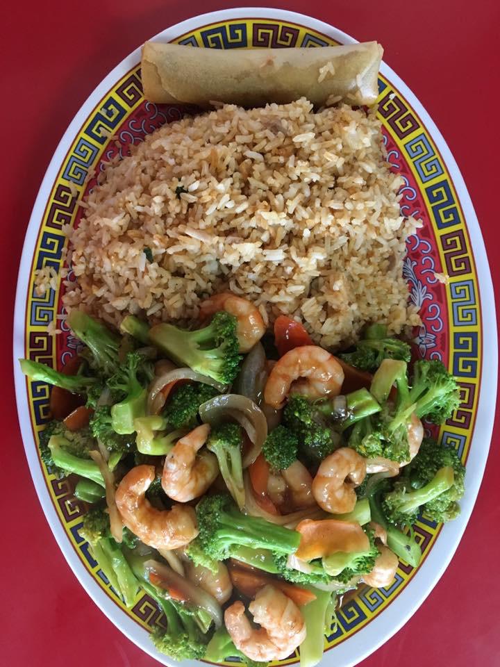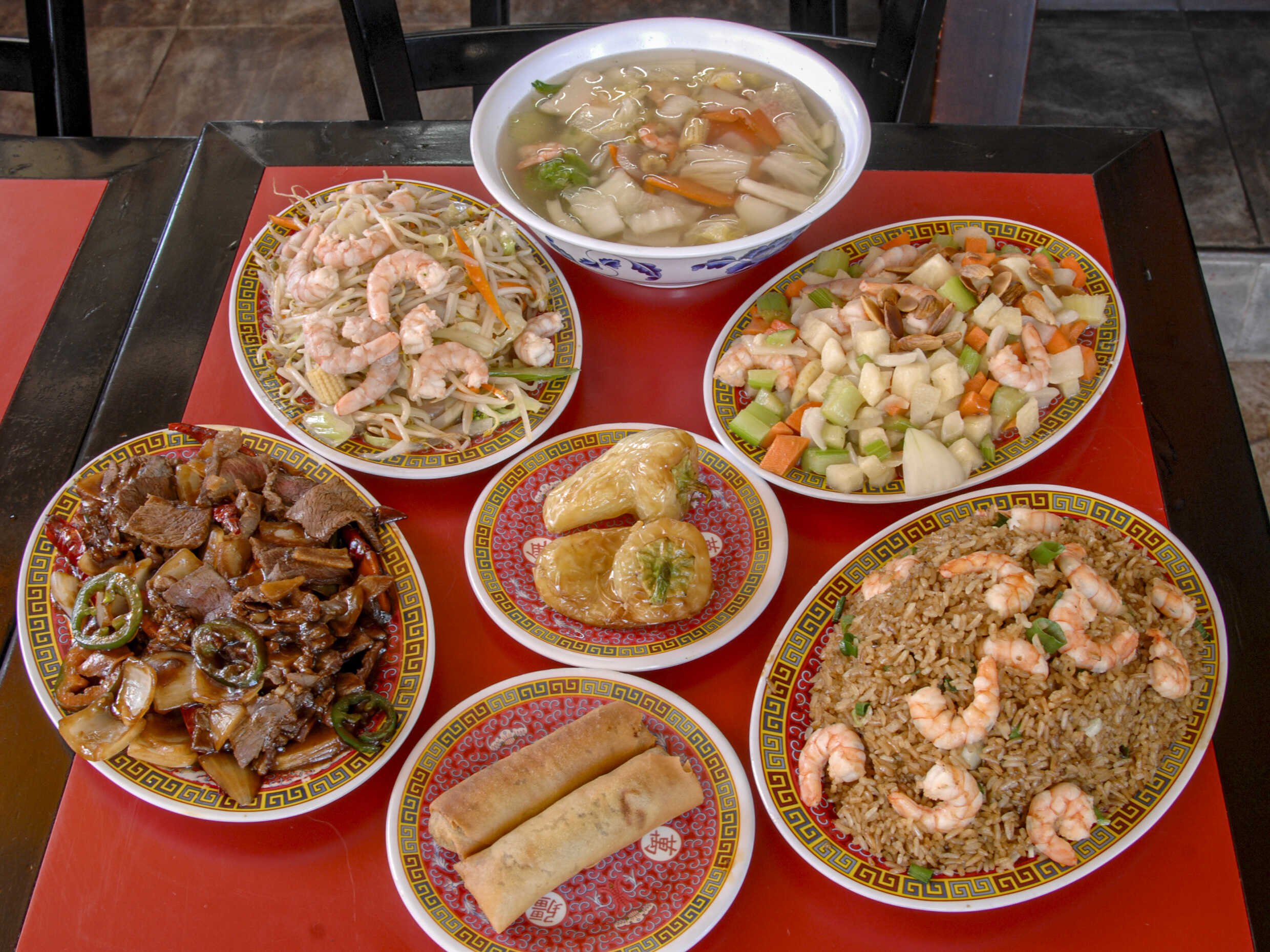 Caldo de aleta, pollo en salsa de ostión, camarón cantonés, combinación china, res mongolia, arroz cantonés y chun kun.