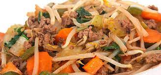 chop suey con res y algunos vegetales con una porcion de aaroz blanco apartre