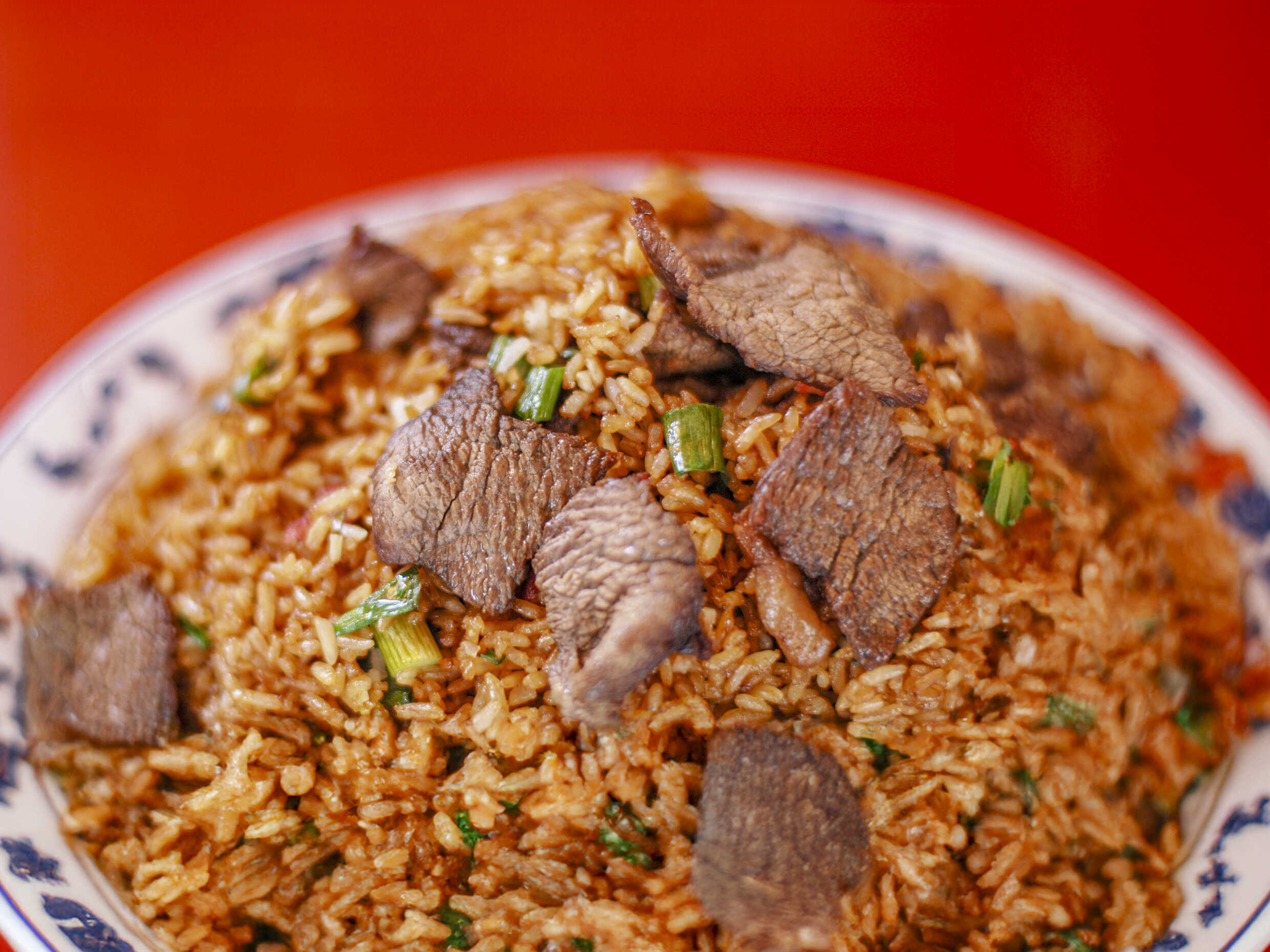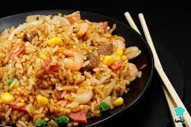 arroz frito con camaron, res, pollo , carnitas rojas, chorizo chino y cebollin