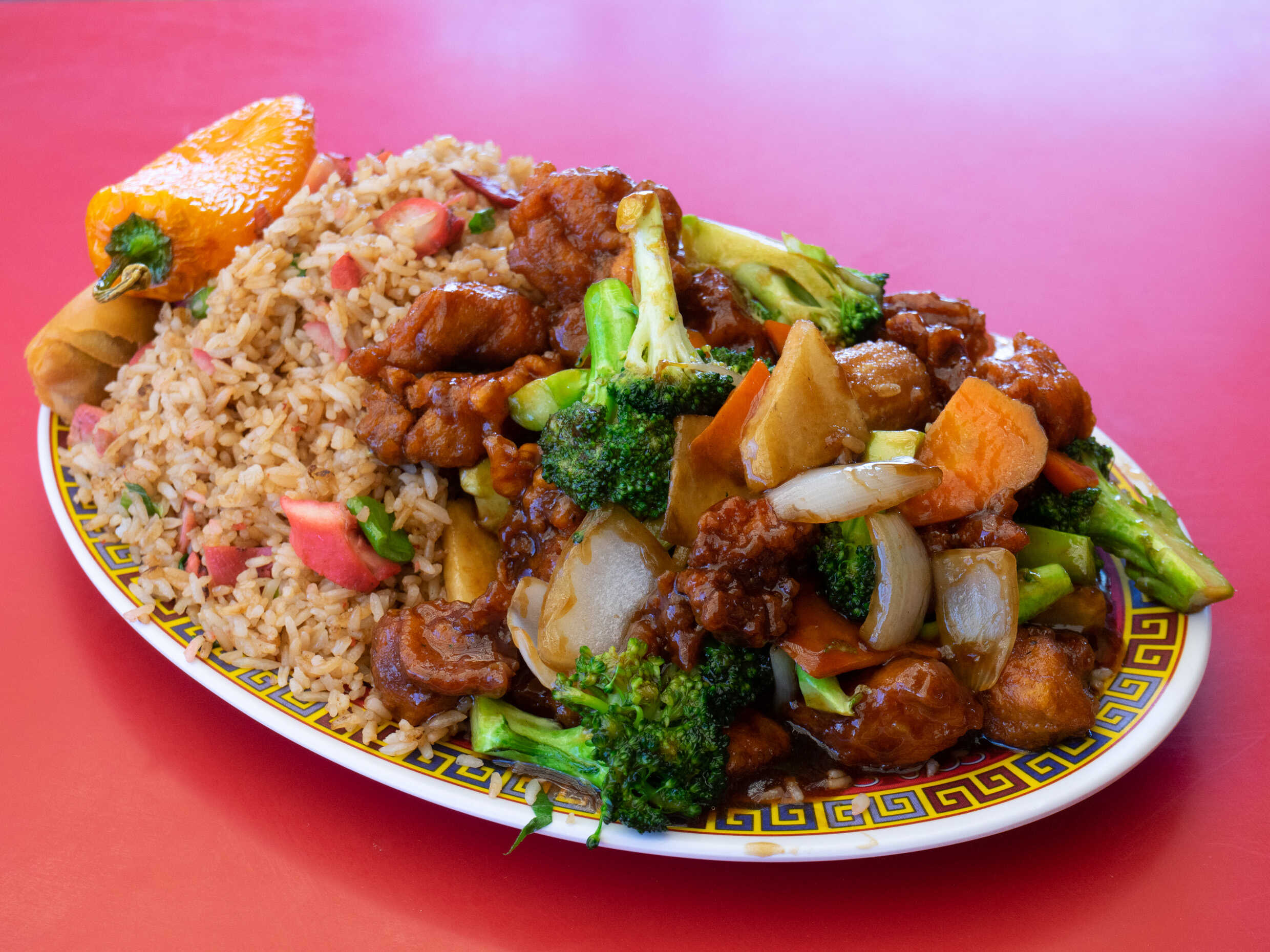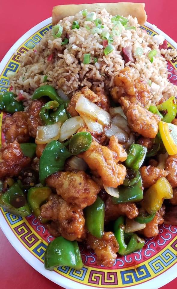 Pollo mongol empanizado con pimiento morron ceboolla y chile pico de pajaro, acompañado de arroz frito y chun kun.