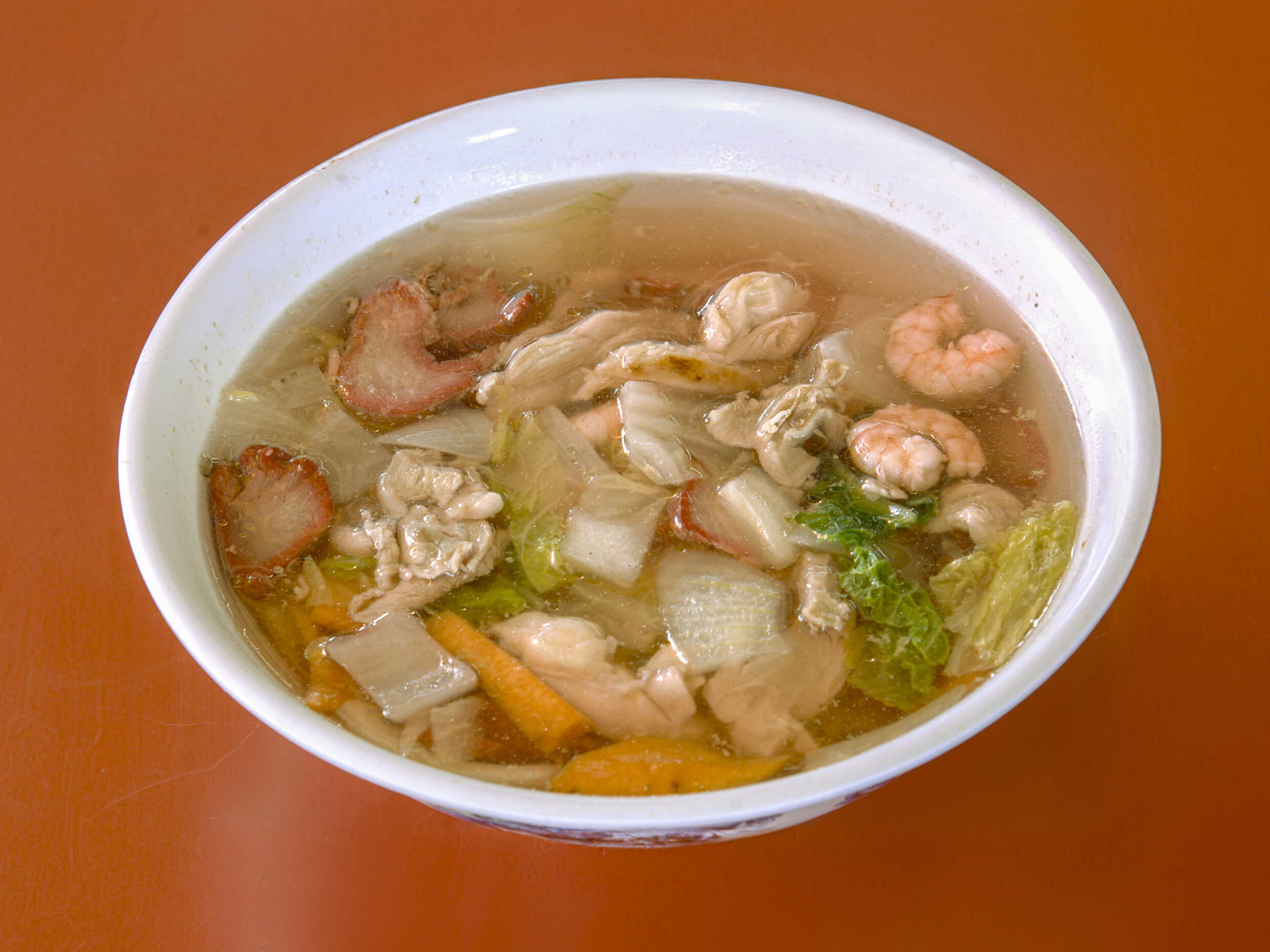 Caldo de camarón, chop suey de camarón, camarón almendrado, res estilo chino, arroz con camaróny chun kun.