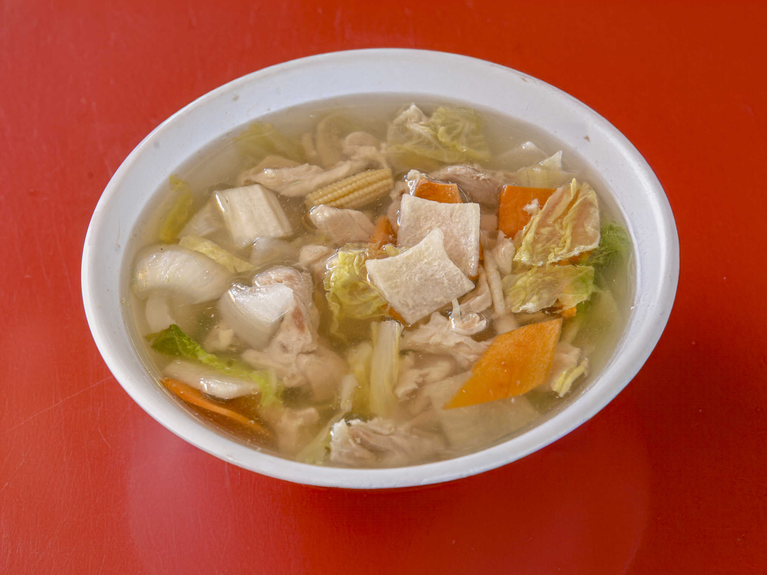 Caldo de napa, arroz frito, chop suey de res, kai kiu-pollo con piñay chun kun.