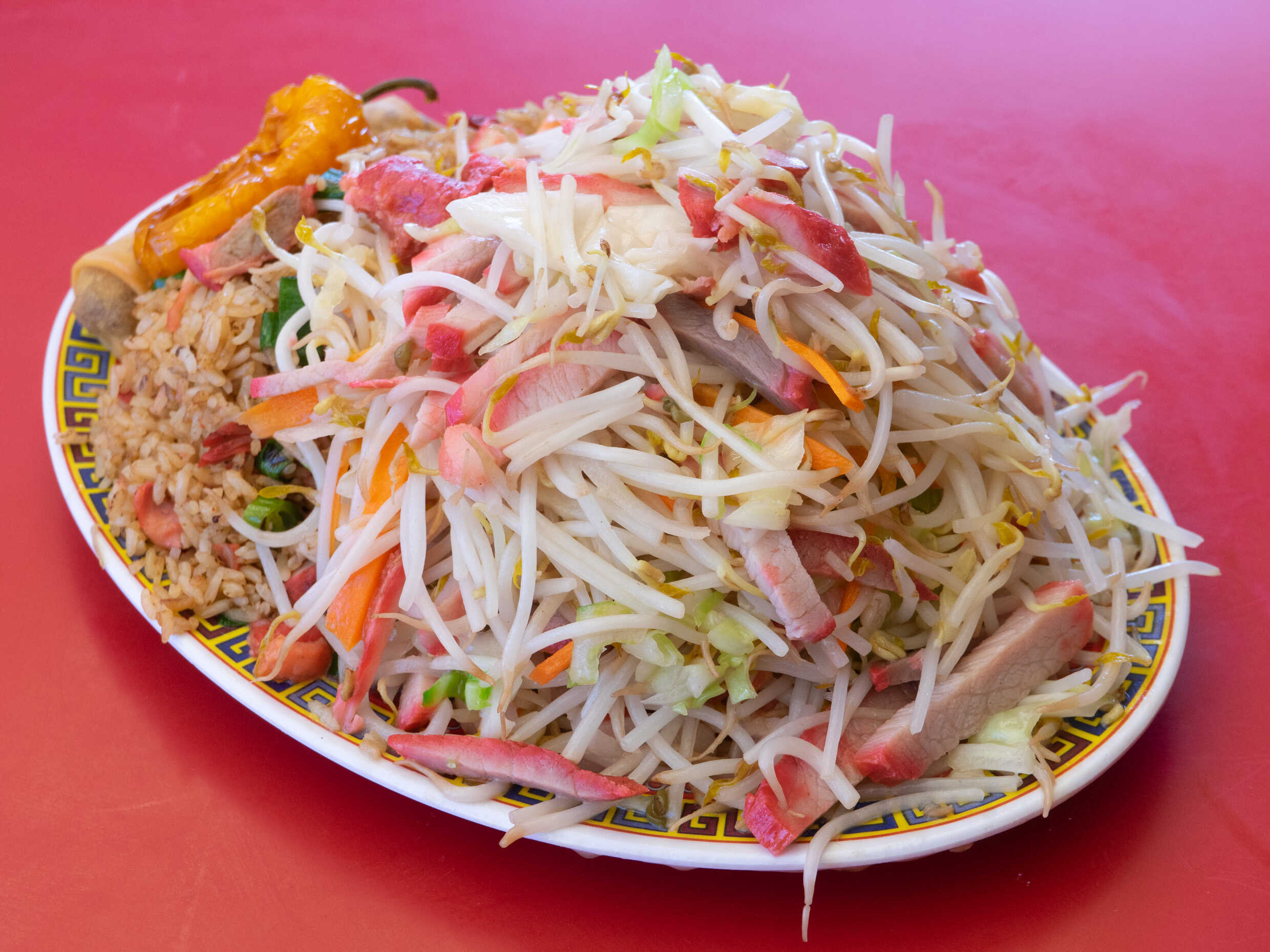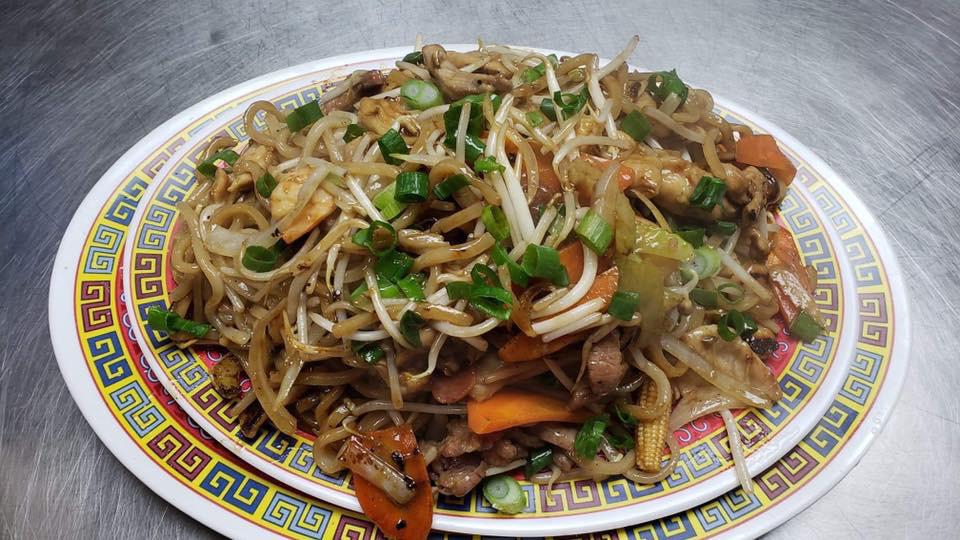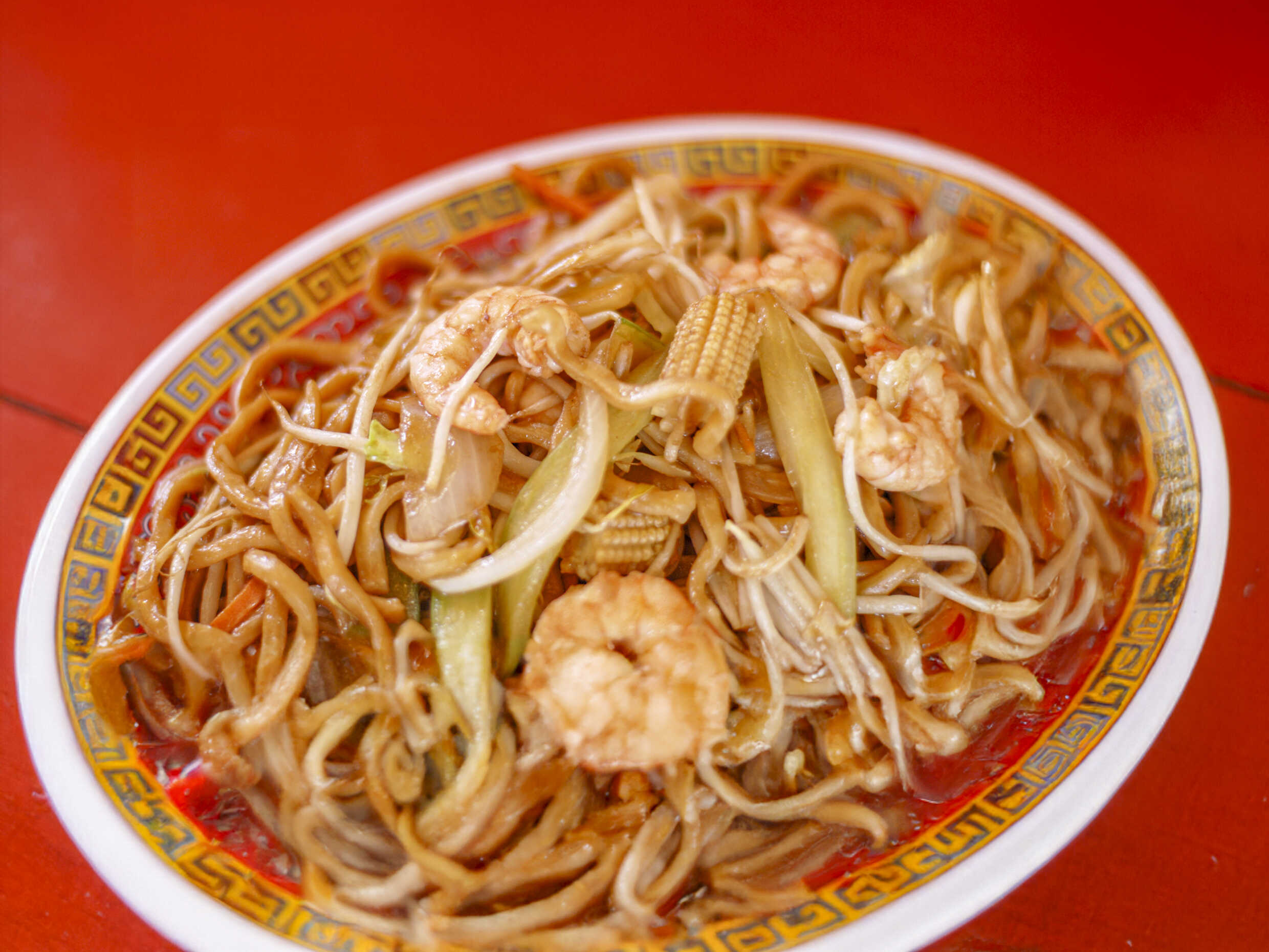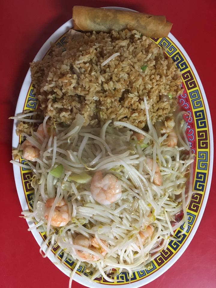 choa mien pasta con camaron, res, pollo ,carnita roja , chorizo chino y algunas verduras con una porcion de arroz blanco aparte