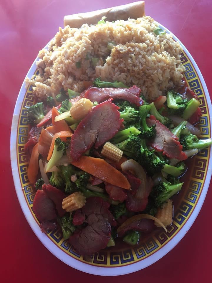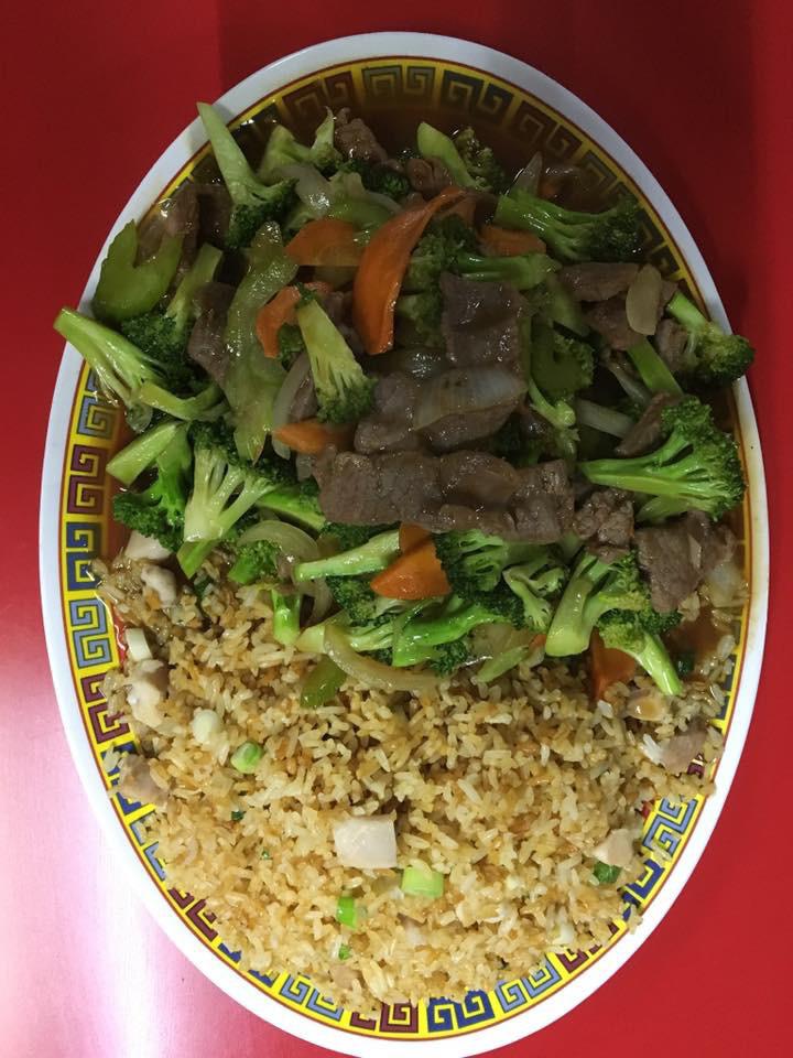 Res con brócoli, zanahoria , cebolla y elotitos acompañado de arroz frito y chun kun.