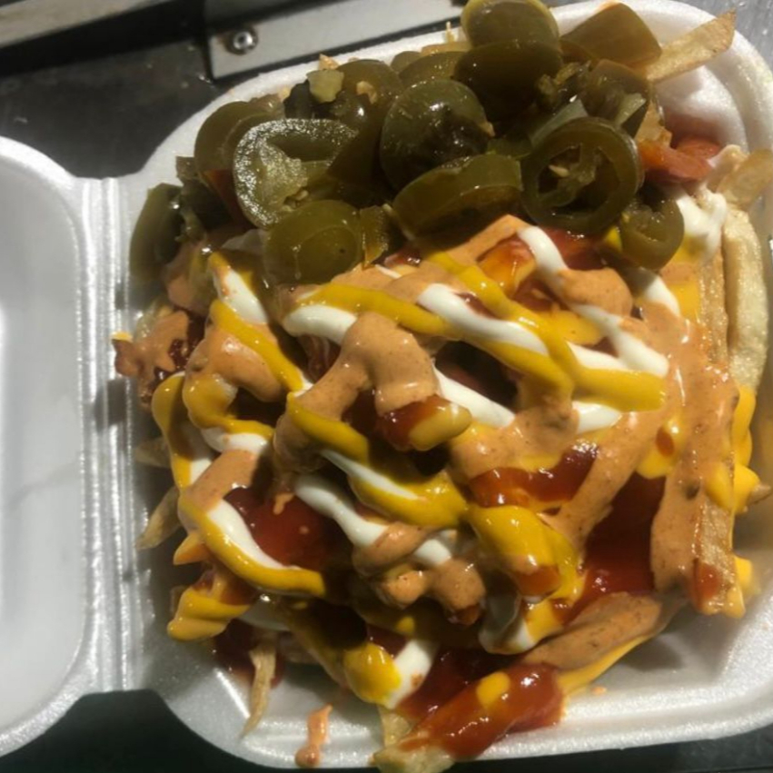 Carne preparada (chile jalapeño, tomate, cebolla cocida o normal, aderezo de chipotle,mostaza y mayonesa,pepinillo y papas naturales con el adereso de chipotle o queso