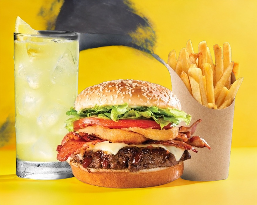 Aros de cebolla y tocino ( incluye papas y bebida).