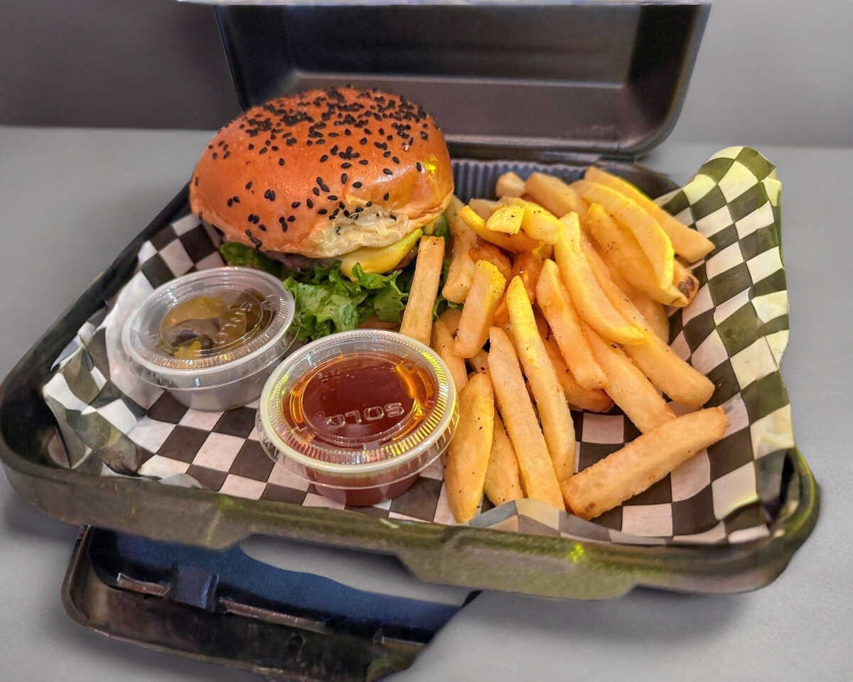 Hamburguesa de 100% Picaña, Servida en un Delicioso Pan Artesanal, con una Lamina de Queso a tu Elección, y unas Deliciosas Papas, Jitomate, Lechuga, Cebolla.