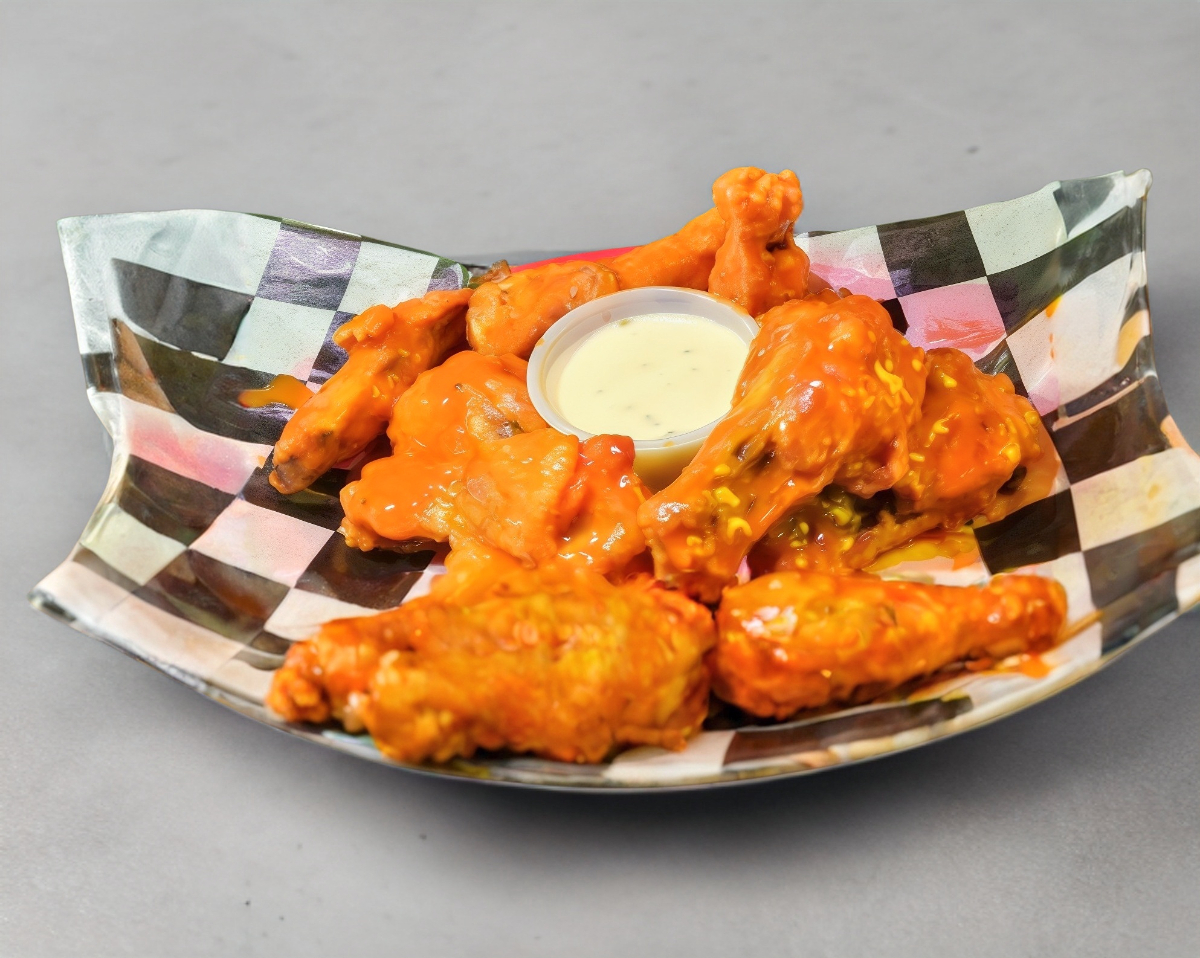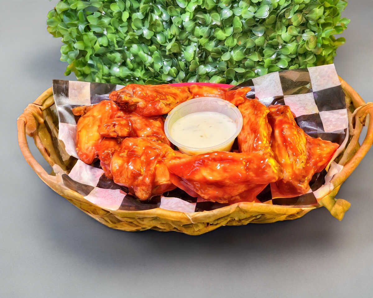 8 Deliciosas Alitas Bañadas en el Aderezo de tu Elección, Servida con unas Exquisitas Papas y Aderezo Ranch