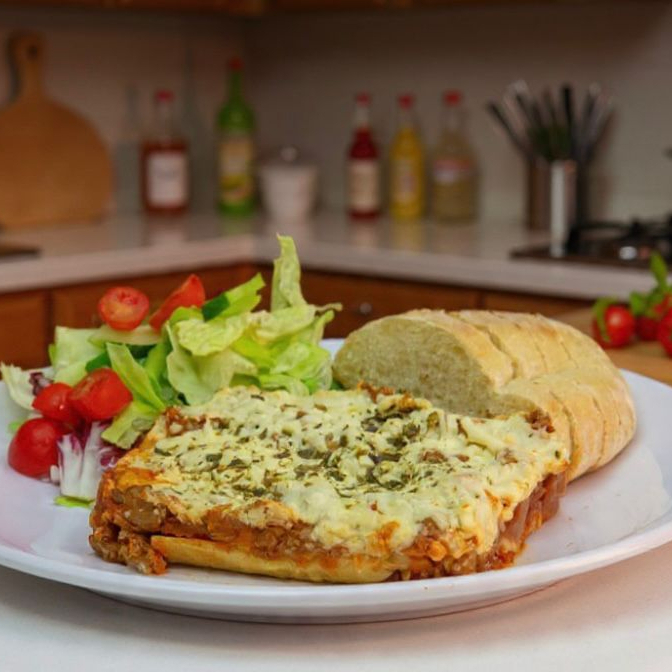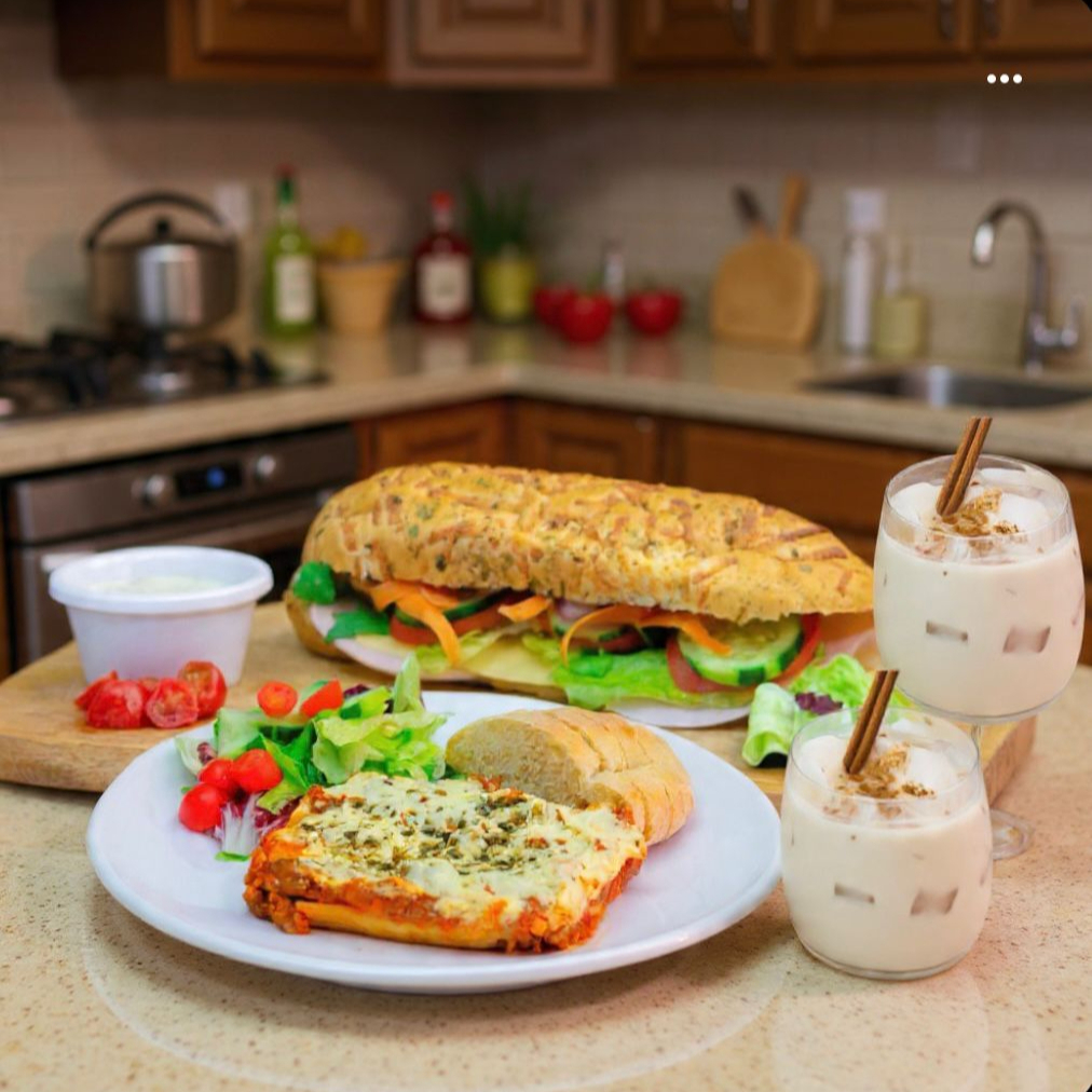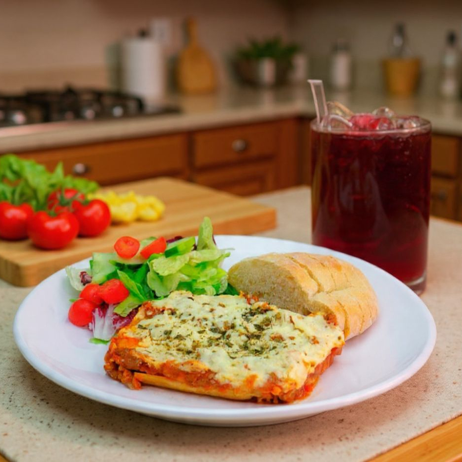 1 Lasagna + 1 Baguette de Jamón Selva Negra con Papas + 2 Agua Fresca