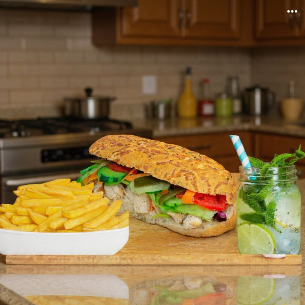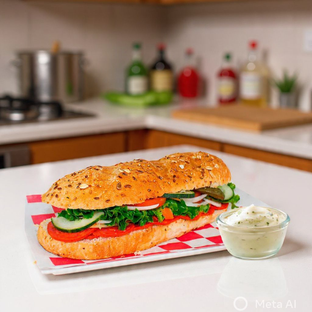 Con pepperoni, jamón selva negra y queso gouda, acompañado de vegetales frescos, lechugas mixtas, cebolla, jitomate, zanahoria, pepino, jalapeño y aderezo, incluye papas a la francesa.