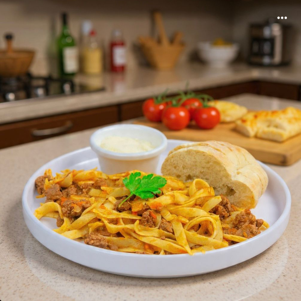 Pasta fetuccine bañada en salsa a la boloñesa, acompañada de pan y queso parmesano.
