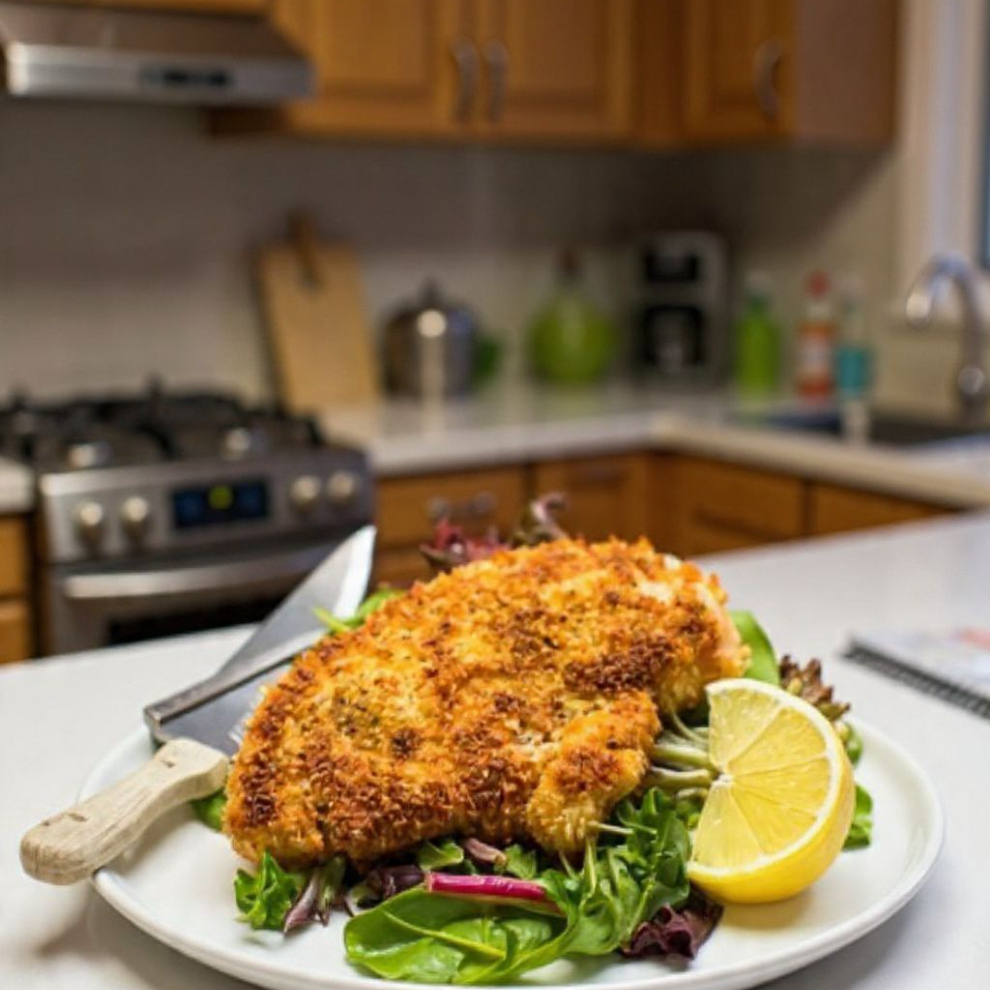Milanesa de Pollo Empanizada. Acompañada de Frijoles Refritos y Ensalada