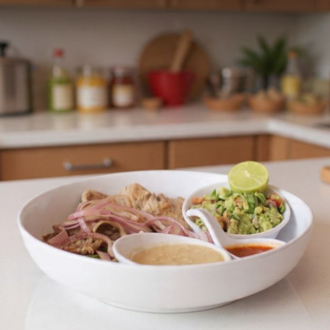 Acompañada de Frijoles Refritos, Guacamole y Tortillas