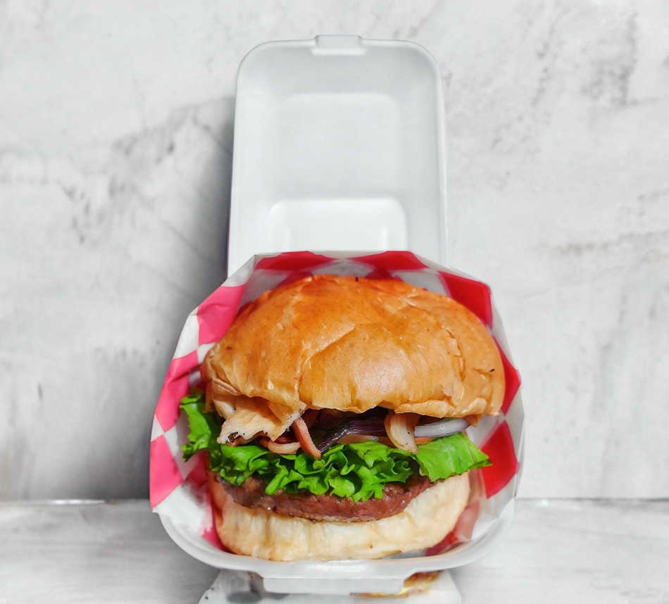 Pan brioche, carne de arrachera, queso amarillo, lechuga, jitomate, cebolla y tocino.