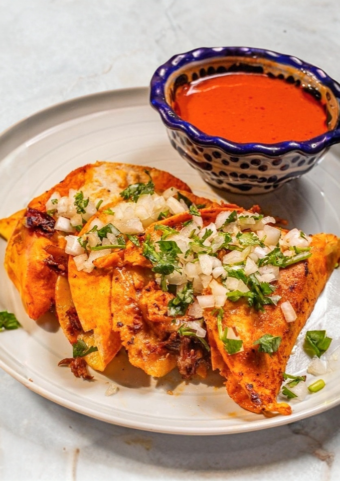 Tortillas, barbacoa, queso gouda fundido, cebolla, cilantro, salsa verde y salsa roja.