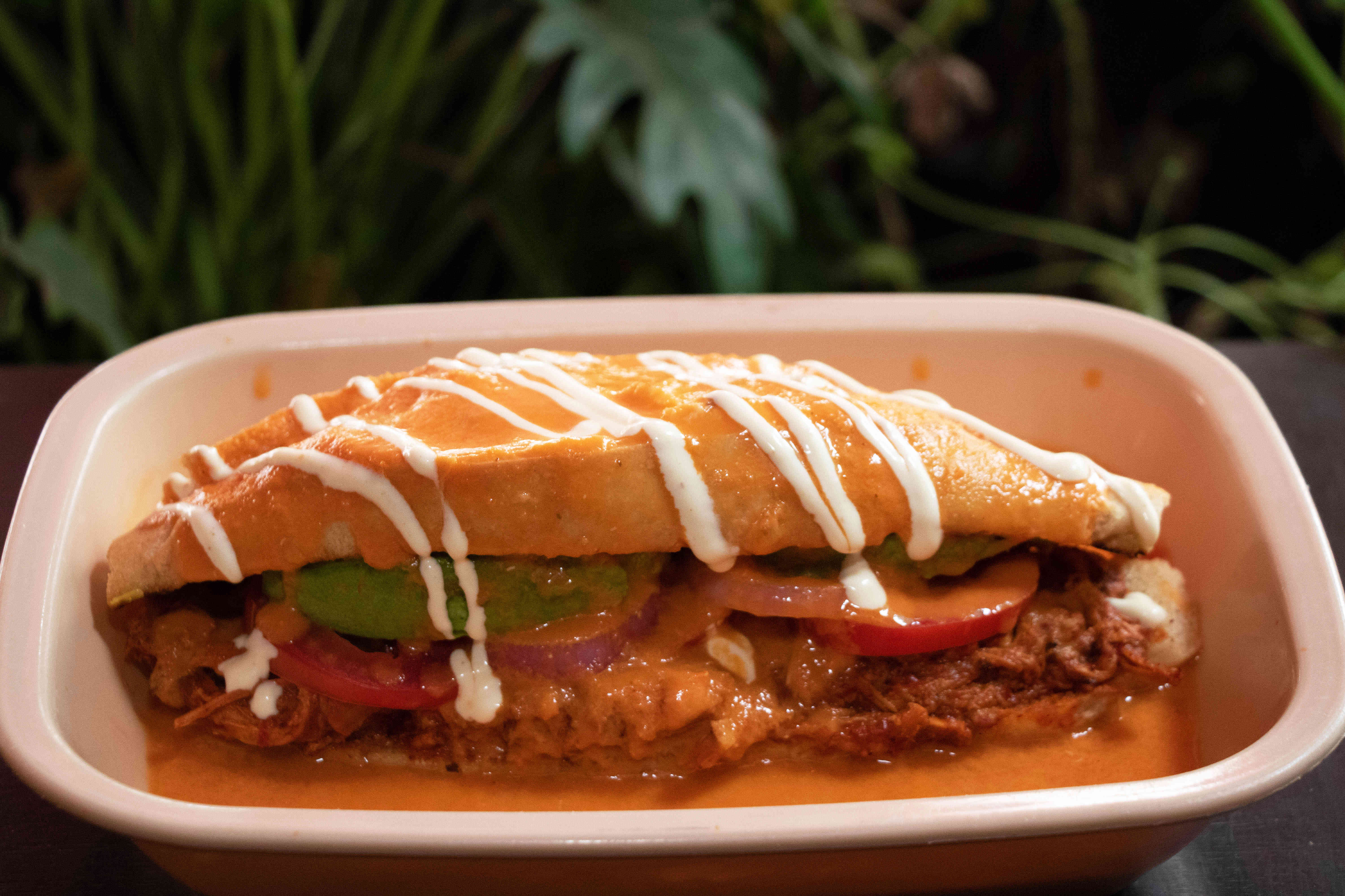 Pierna guisada, tocino gratinado con queso manchego, lechuga, jitomate, aguacate y cebolla.