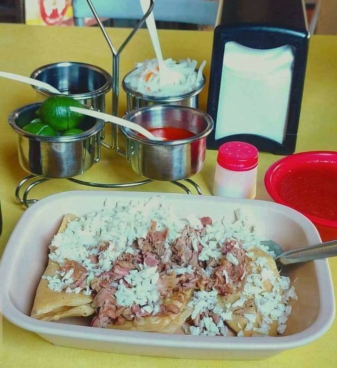 Res, jamón, tocino gratinado con queso manchego y queso americano. Cebolla, pimiento, guisado, aguacate, jitomate y ensalada de col con zanahoria.