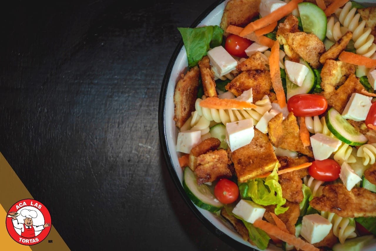 Pasta, panela, lechuga oreja, espinaca, zanahoria rallada, pepino, jícama, jitomate, semillas y crotones.