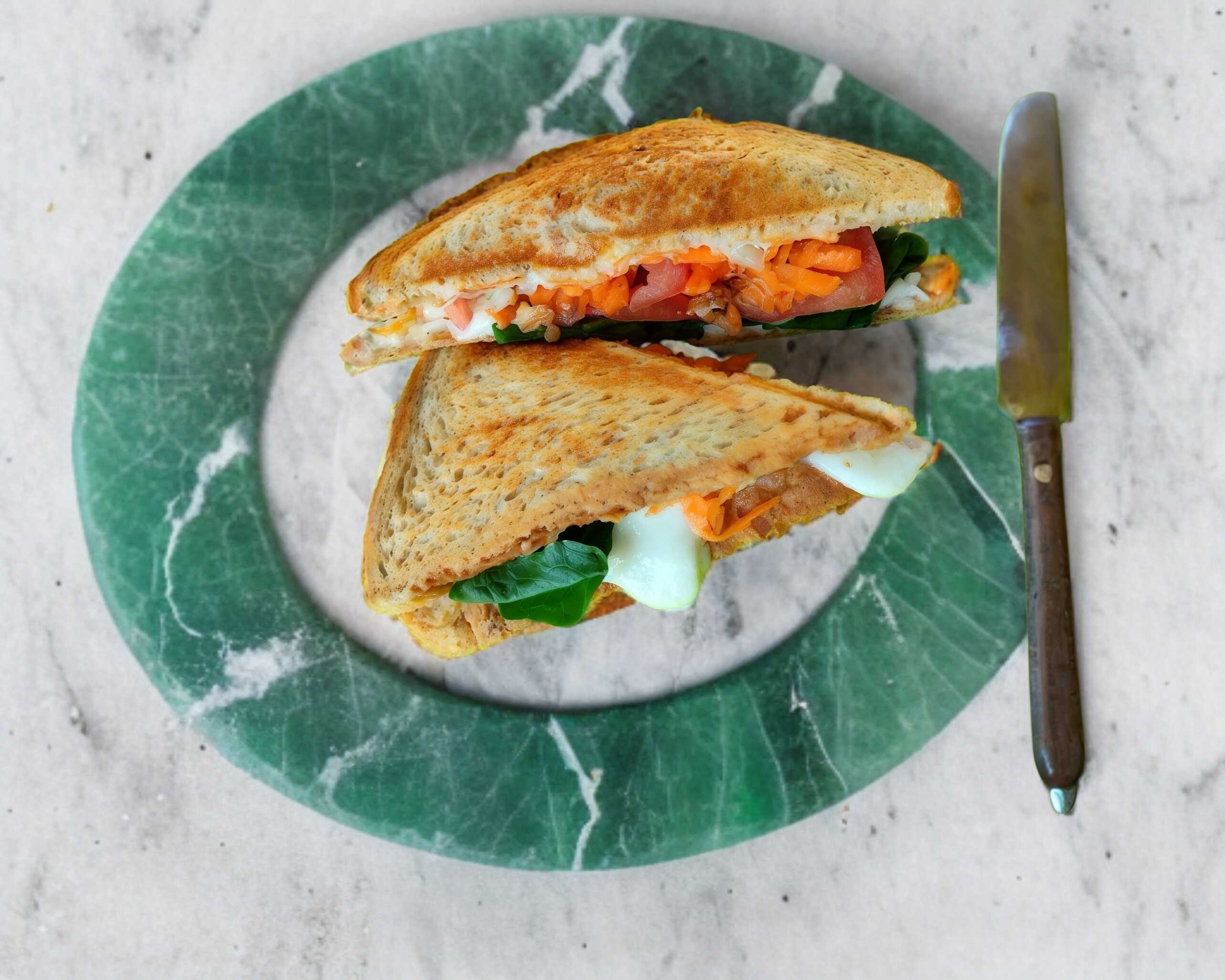 Pan doble cero con 100gr de panela, espinacas, zanahoria rallada, pepino y jitomate acompañado de papas o chayotes adobados