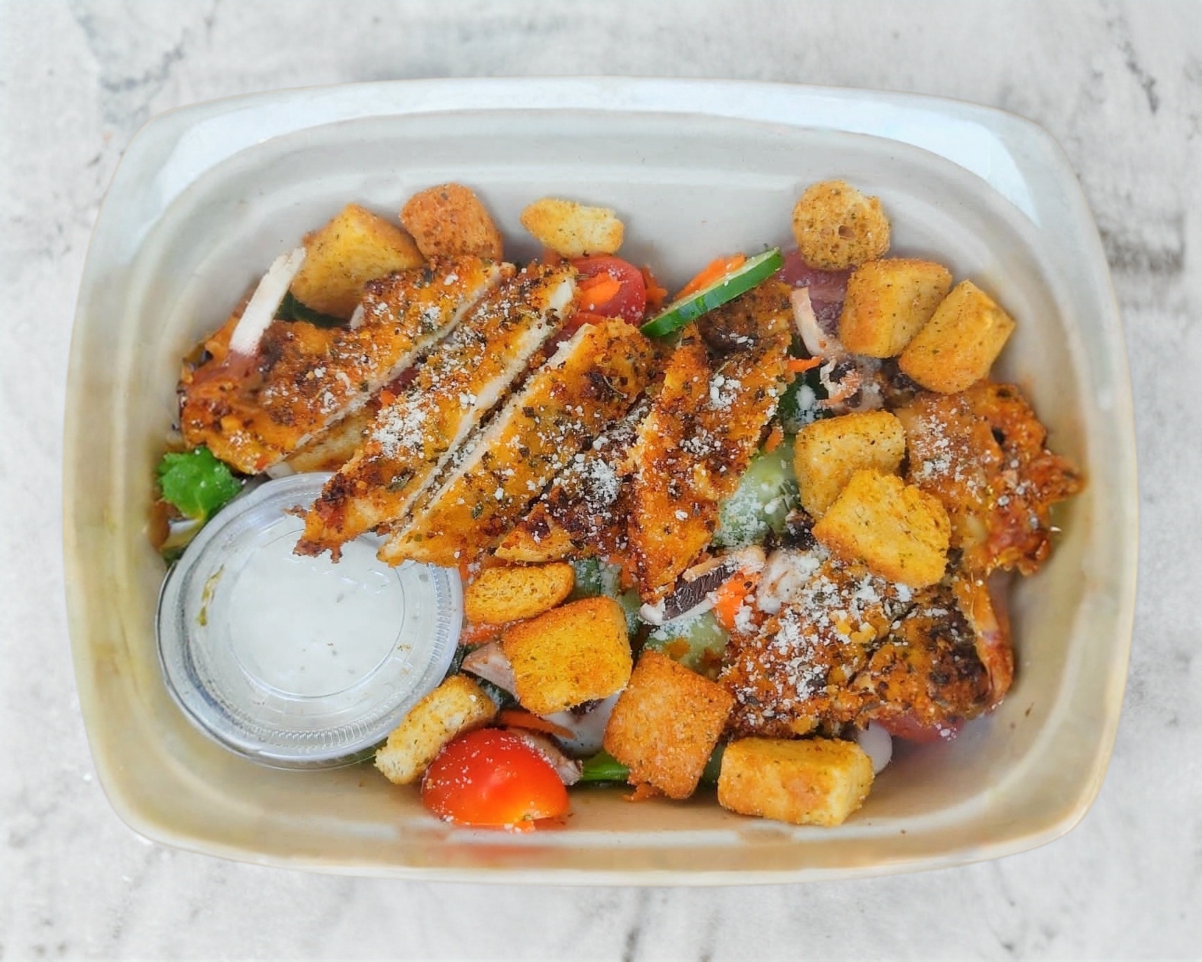 Mix de lechugas, champiñones, pepino, cherrys, croutones, queso parmesano con milanesa empanizada