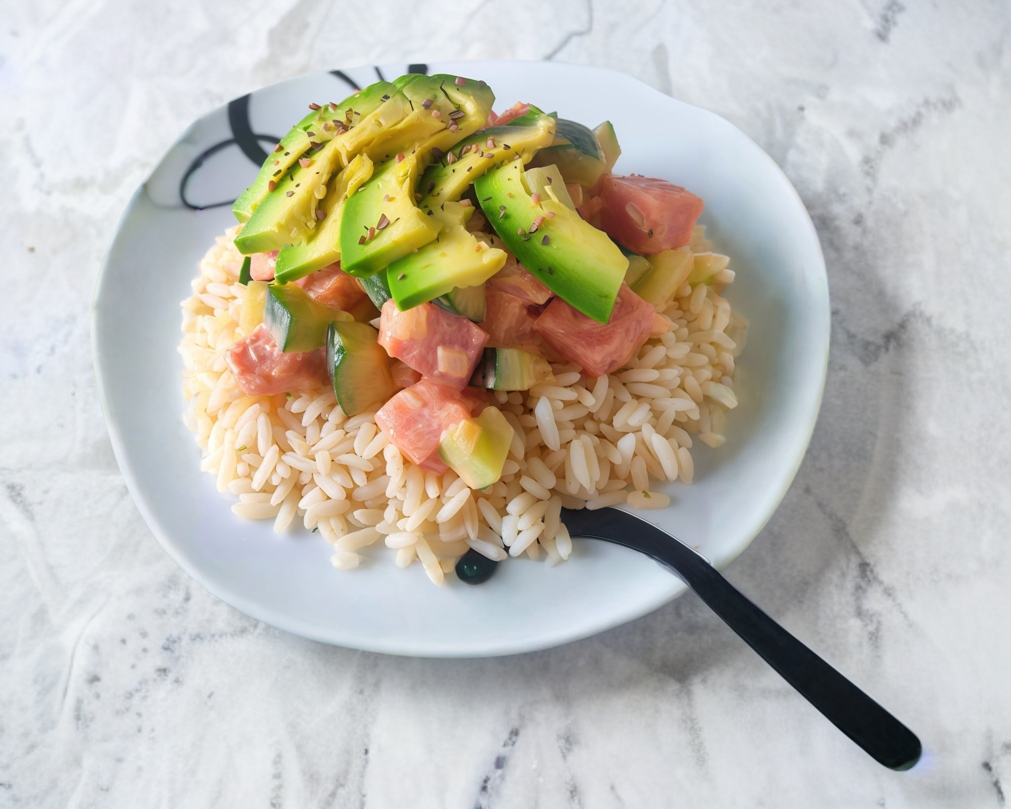 arroz blanco coronado con una mezcla de atún, pepino, cebolla en cubos y aderezo mayo-spicy, acompañado de aguacate