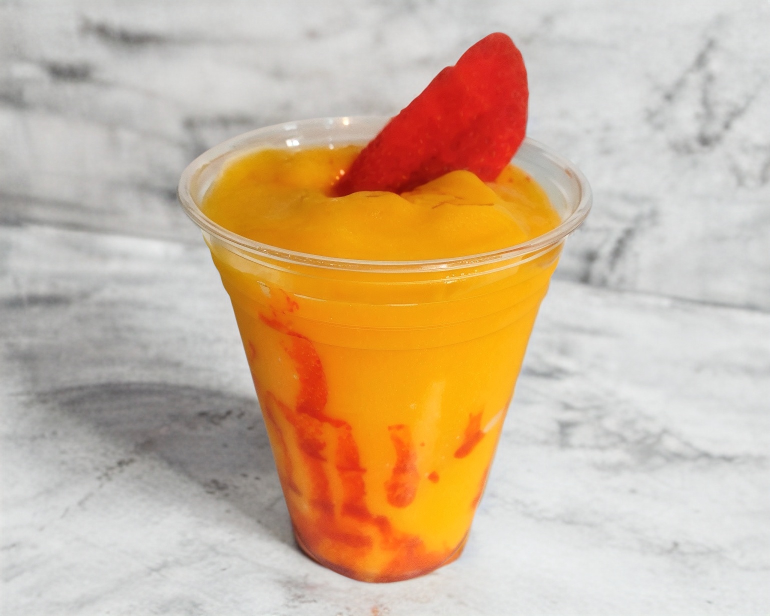 base de agua con jugo de naranja, mango y piña decorado con chamoy