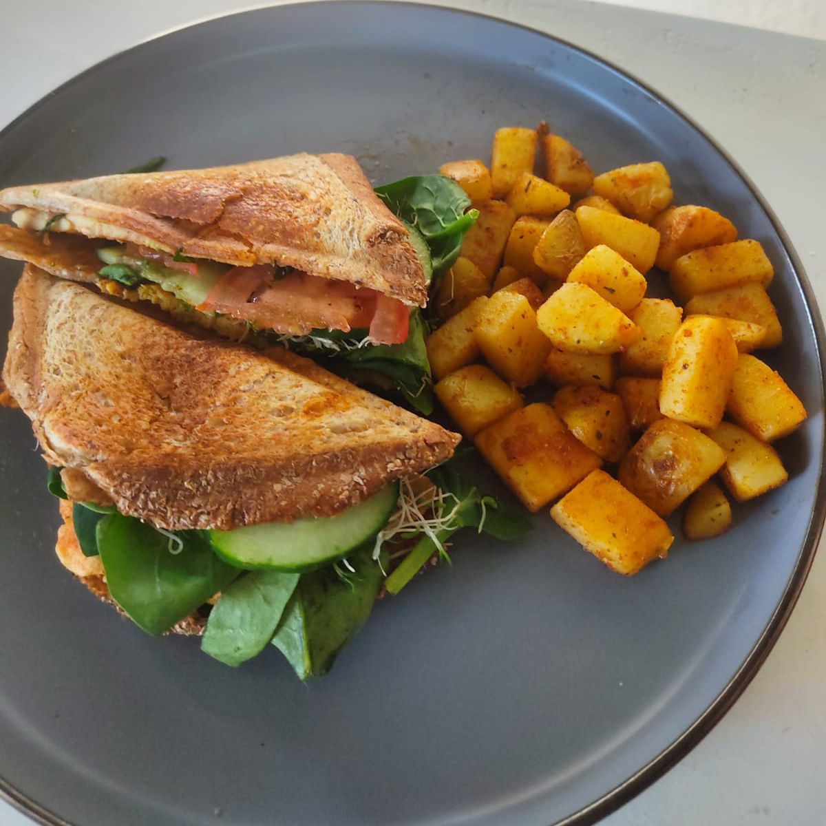 Pan doble cero con 120 gr de milanesa de pollo a la plancha, espinacas, germen, pepino y jitomate acompañado de papas o chayotes adobados