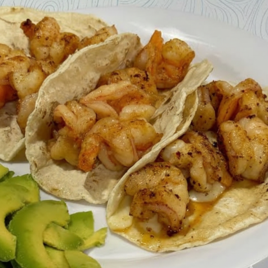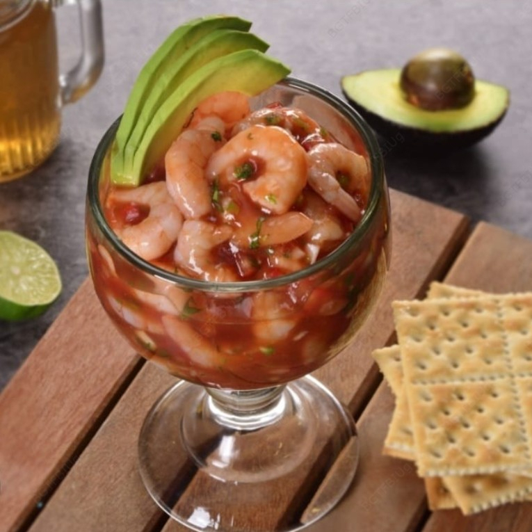 Camarón marinado, salsa de la casa, cebolla morada, pepino, chiltepín, cubitos de mango en temporada y aguacate.