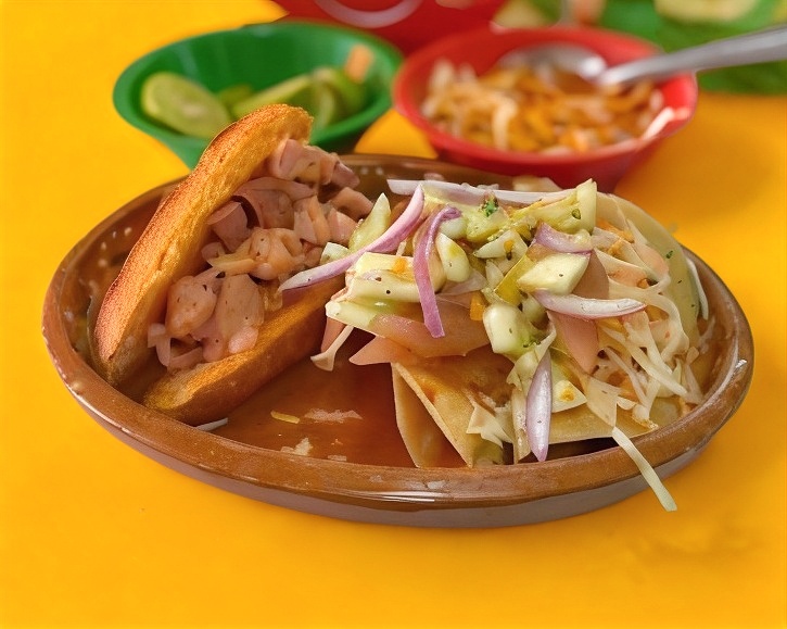 Torta ahogada tradicional de carnitas y salsas recién echas y limon