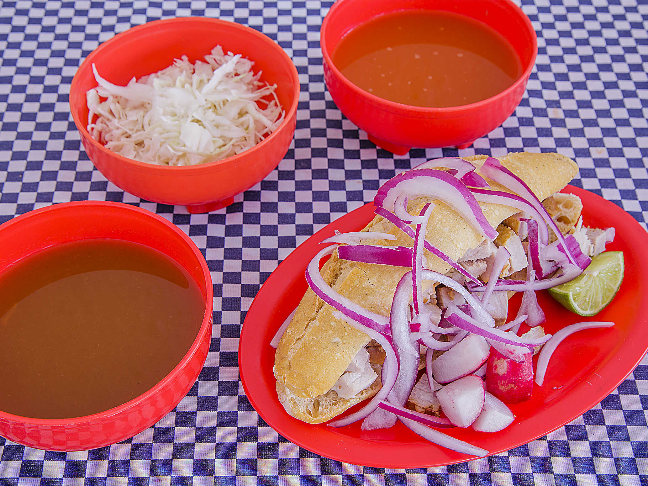 3 tortas ahogadas de carnitas y sus complementos